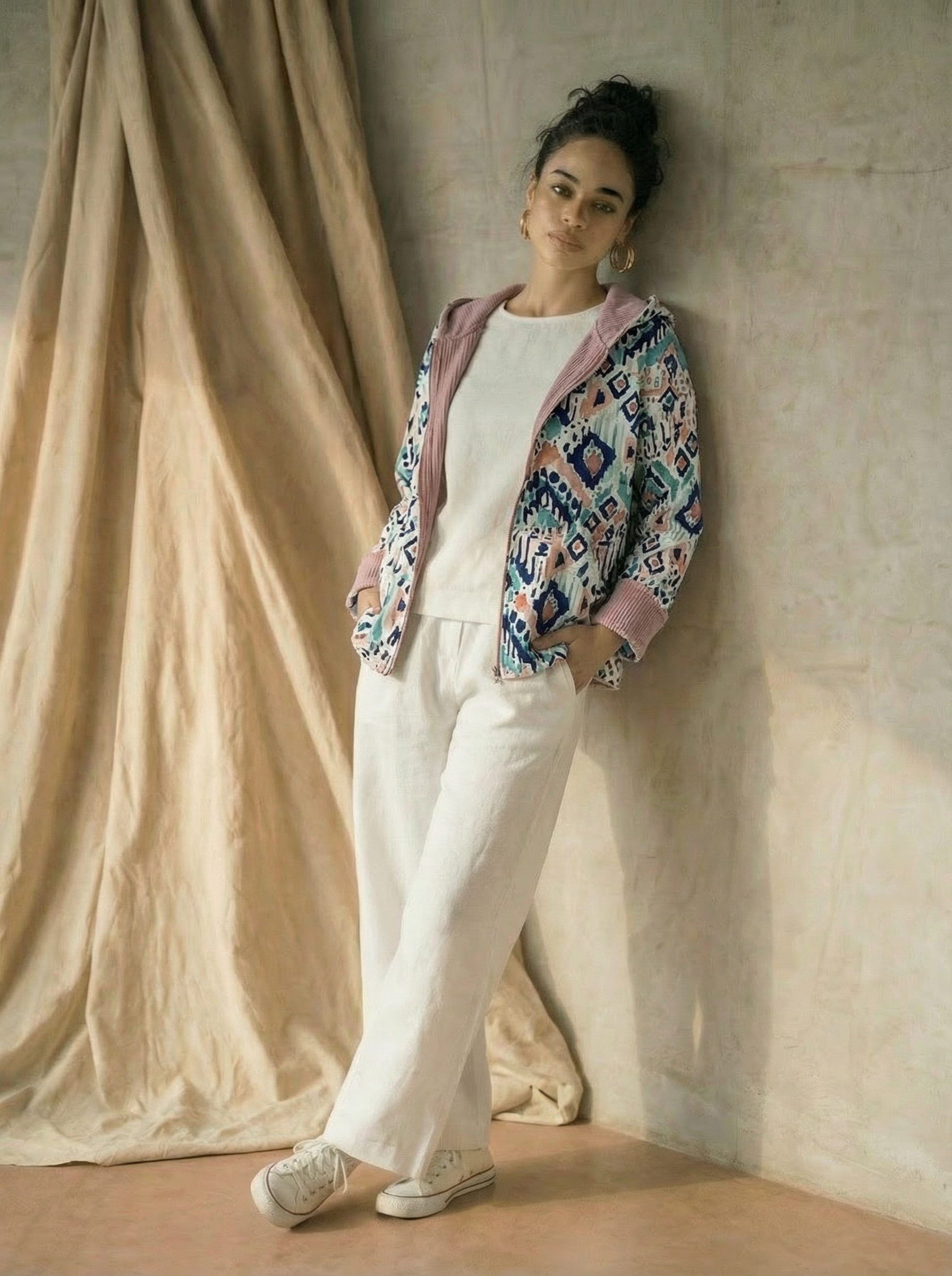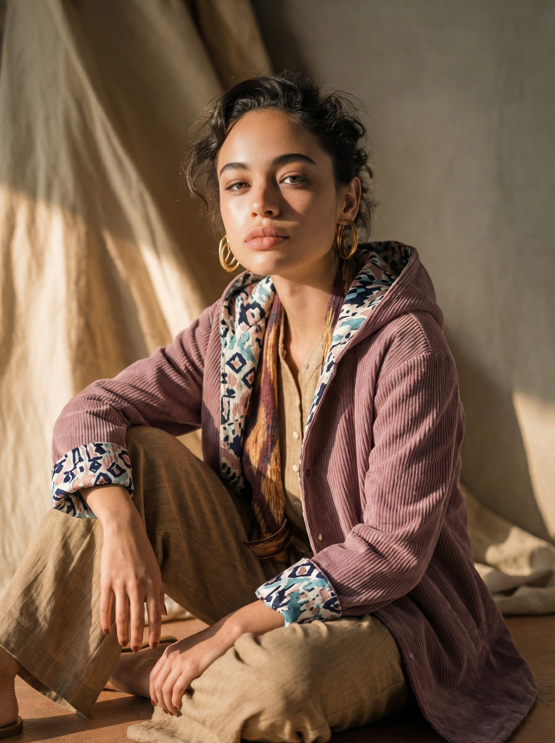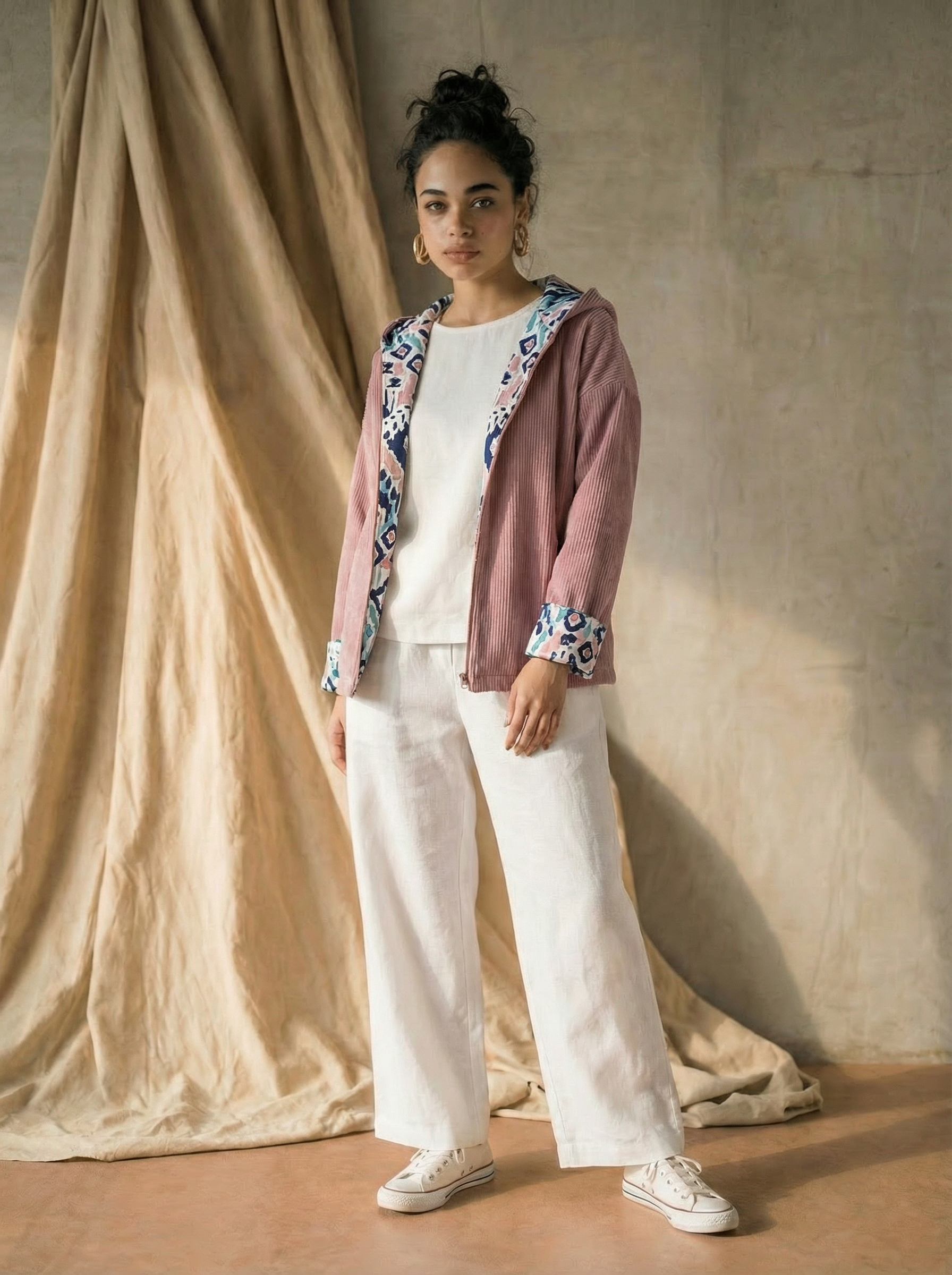 “Evara” is a reversible jacket that blends softness, color, and comfort in one piece. One side is made of cozy pink corduroy, and the other features a feminine ikat print in blue and pink. The fit is easy, warm, and practical, making it perfect for everyday wear. It offers a chic, stylish look while staying comfortable and versatile.
