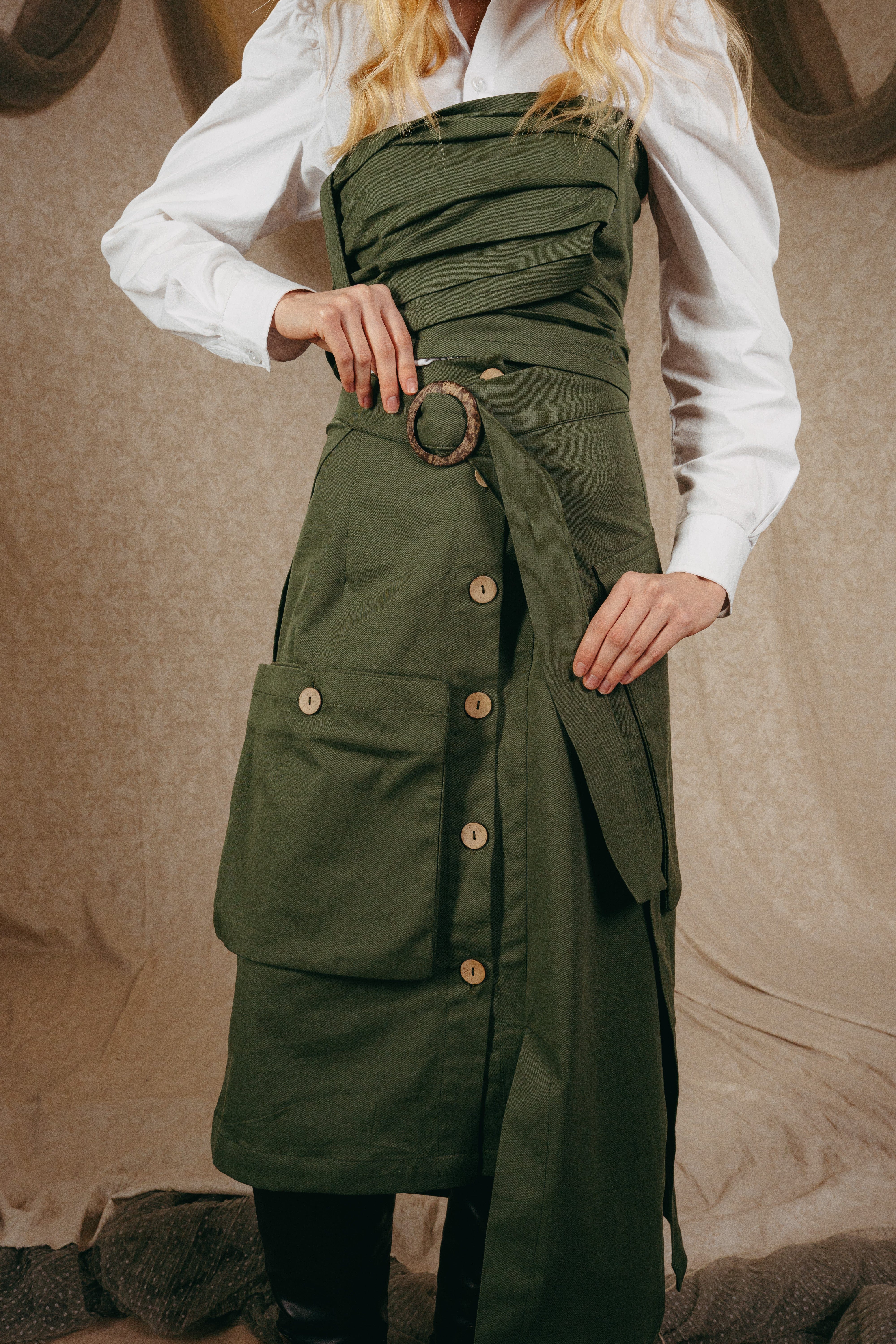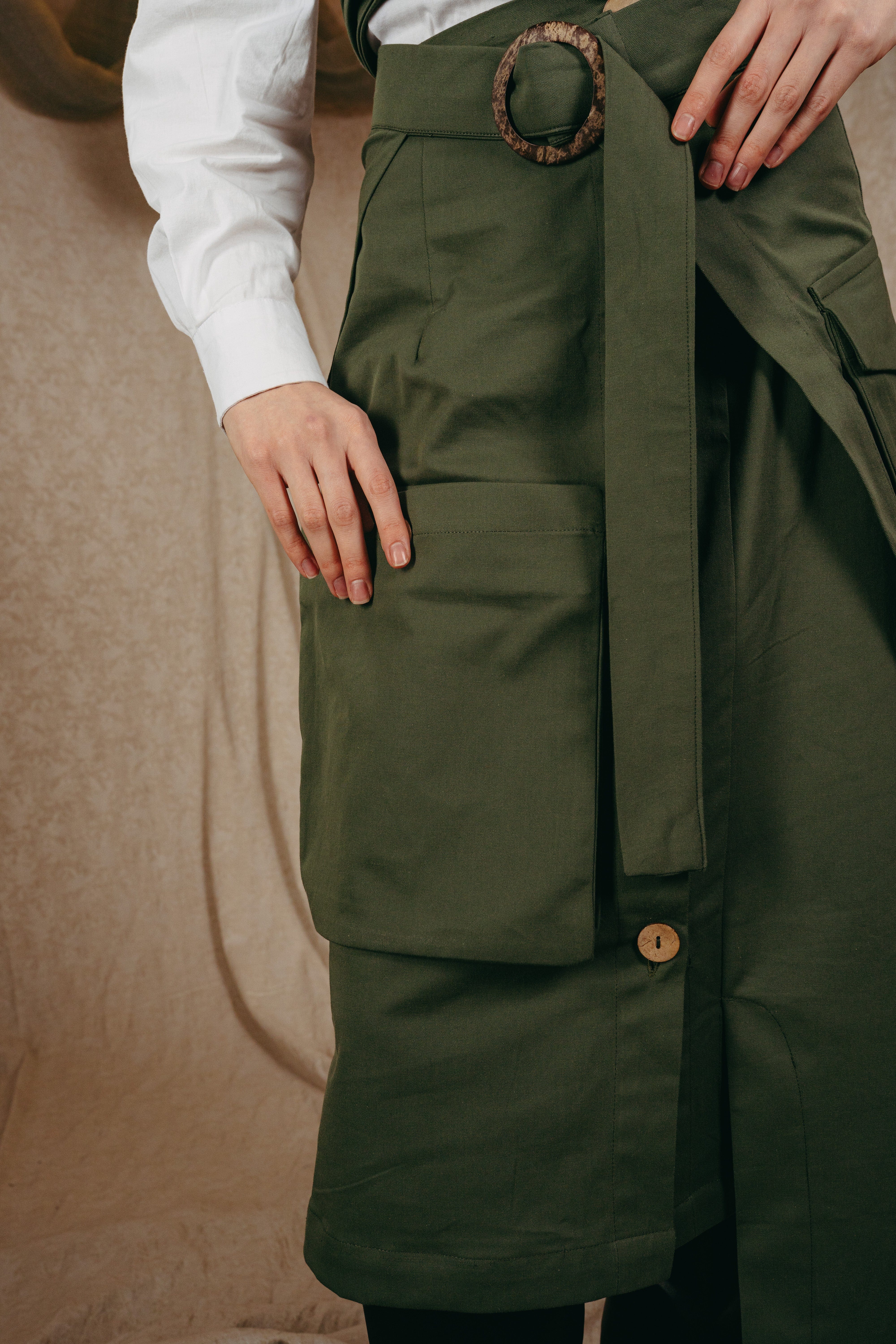Redefine functionality and style with the “Future Femme Skirt.” This mid-length masterpiece, inspired by military design, is both practical and bold. With multiple oversized pockets for utility and an extra belt to accentuate your silhouette, this skirt offers a fresh and edgy version of you. Perfect for making a statement while staying
