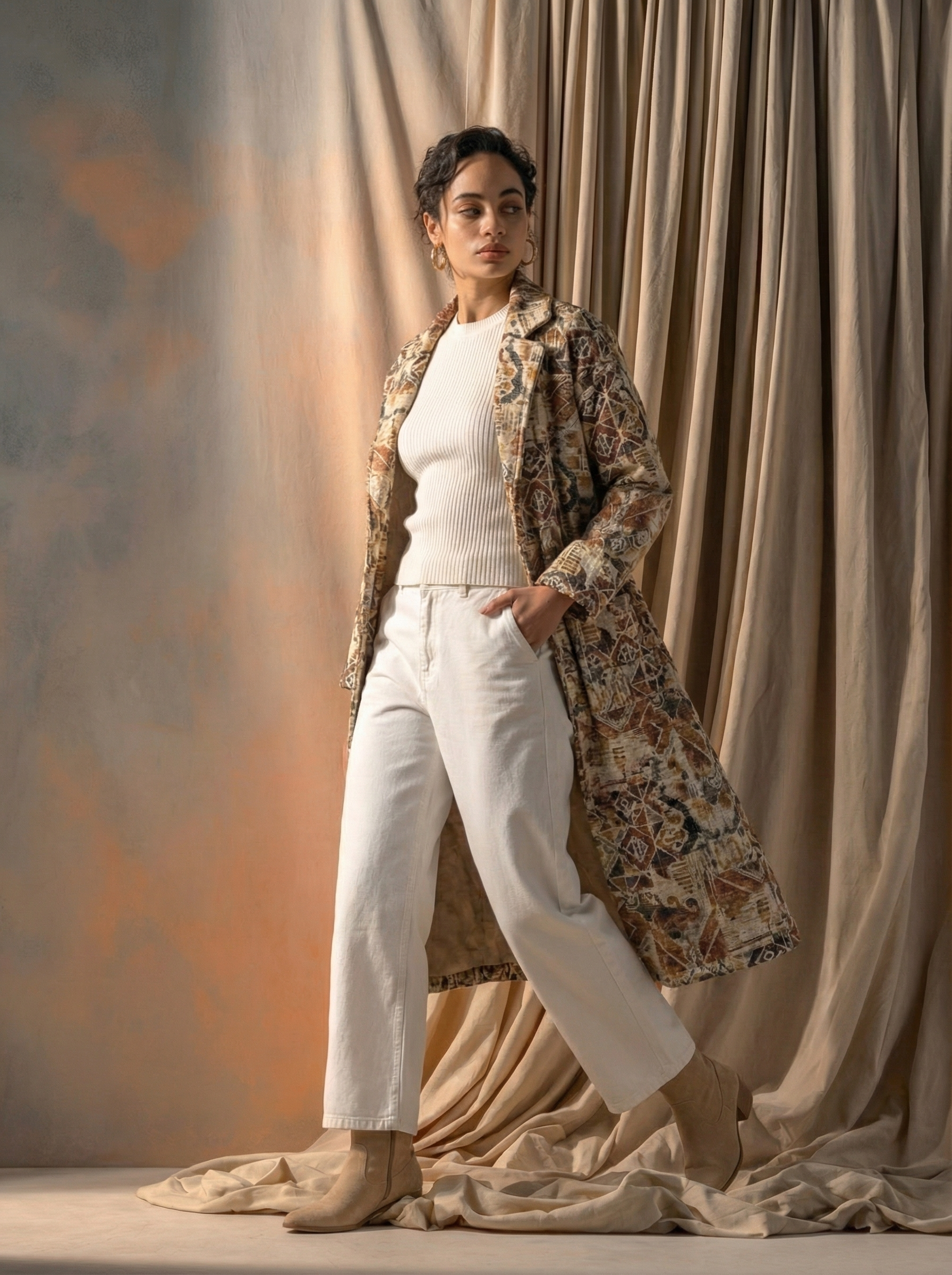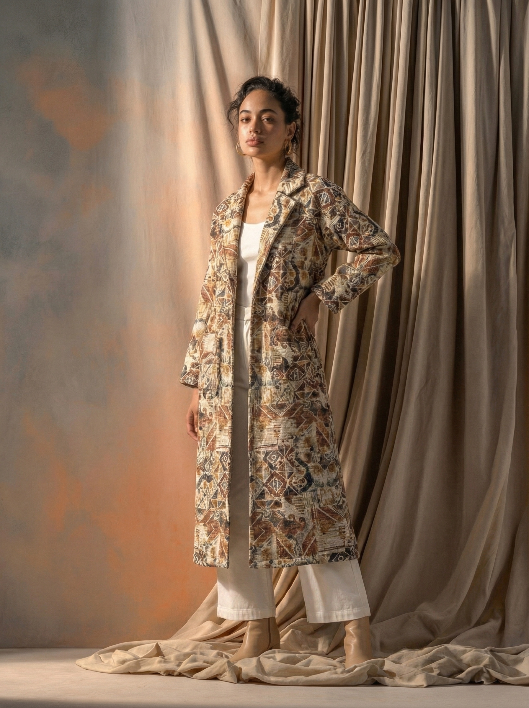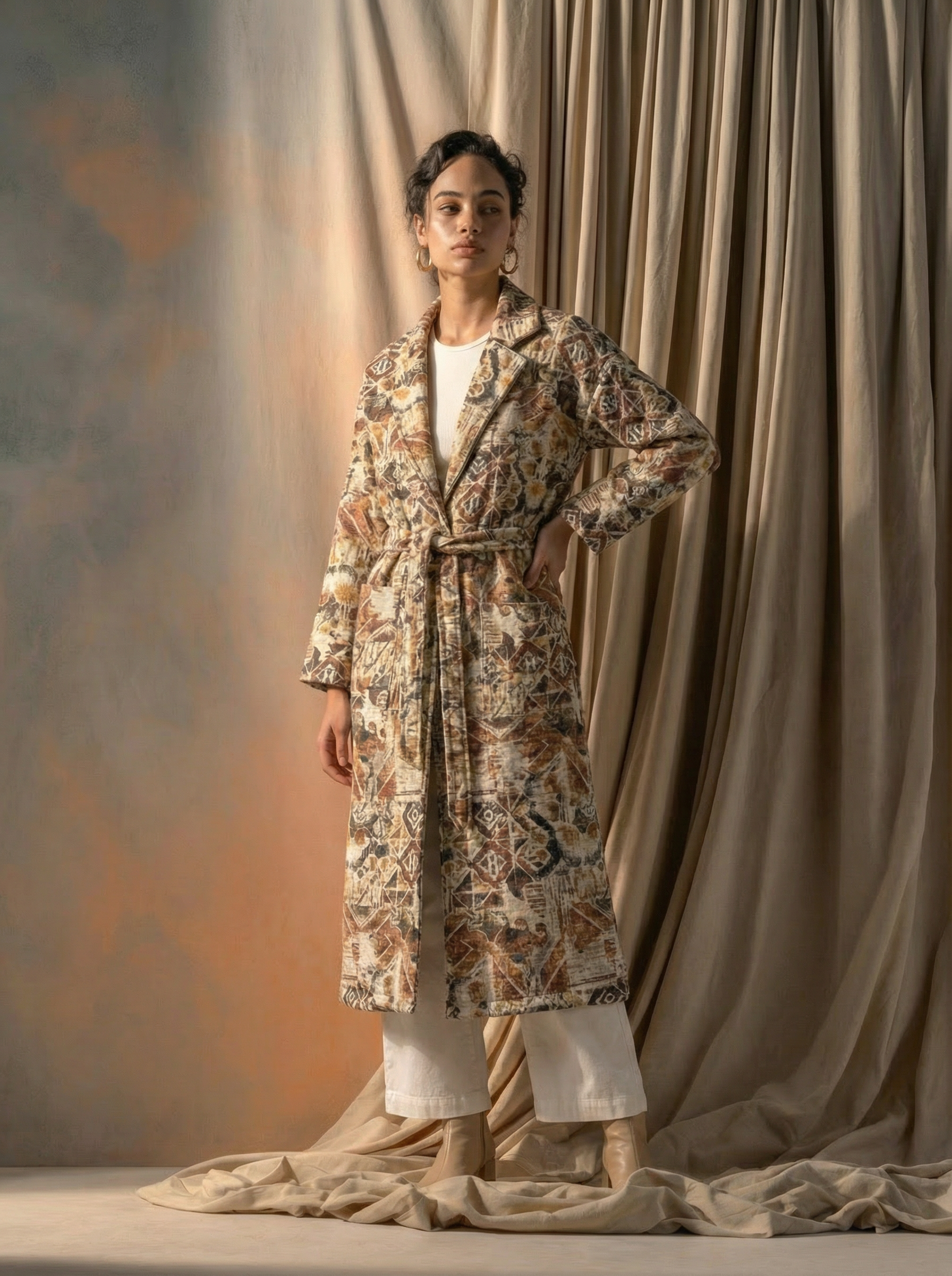“Miraal” is a full-length wool coat that feels warm, cozy, and striking. The ikat-inspired print mixes earthy tones with detailed shapes, giving the coat an oriental mood with a touch of Meroe influence. The silhouette is long and elegant, designed to wrap the body comfortably while making a strong visual statement. Miraa is a standout winter piece that blends culture, warmth, and style in one design.