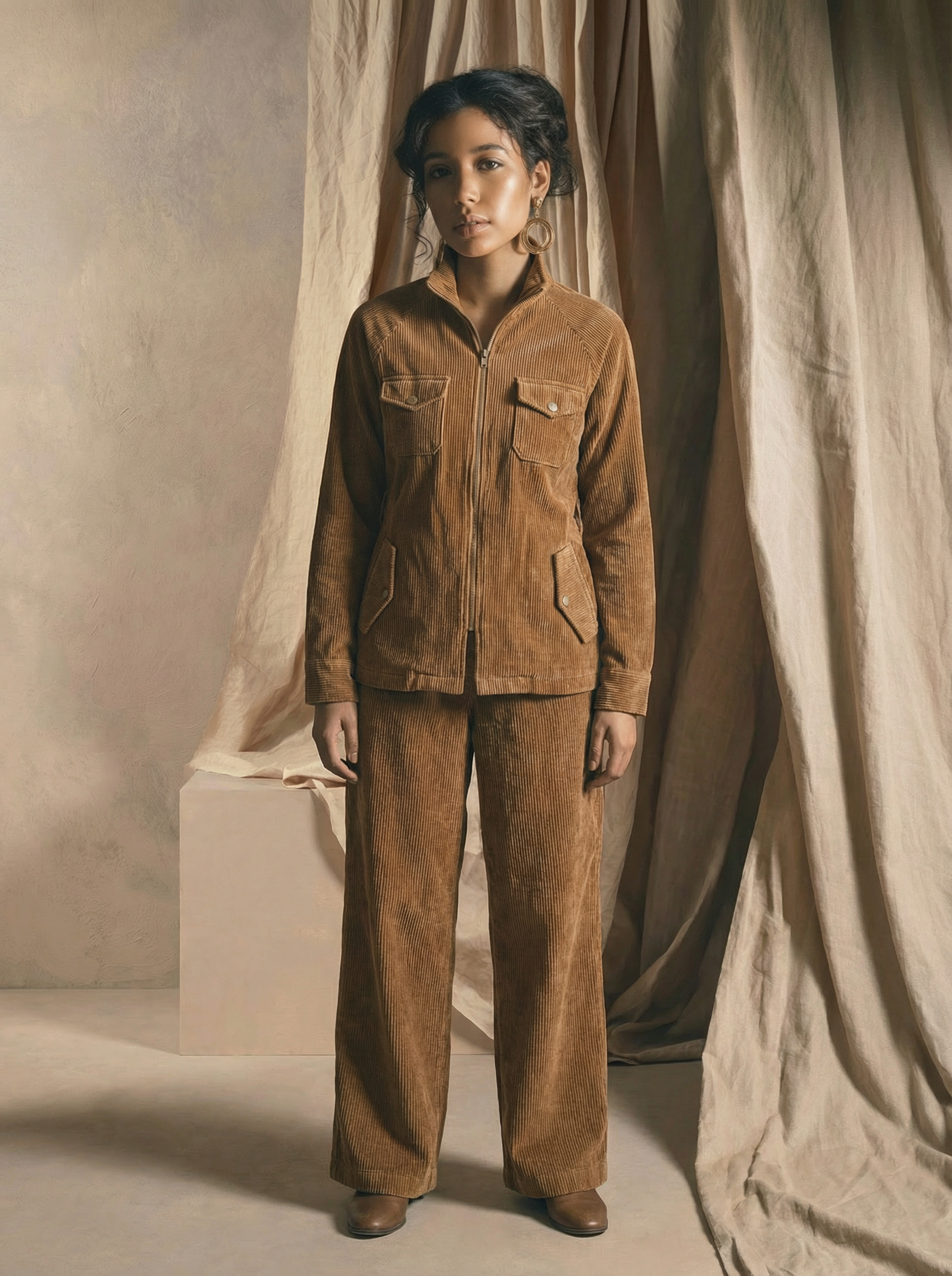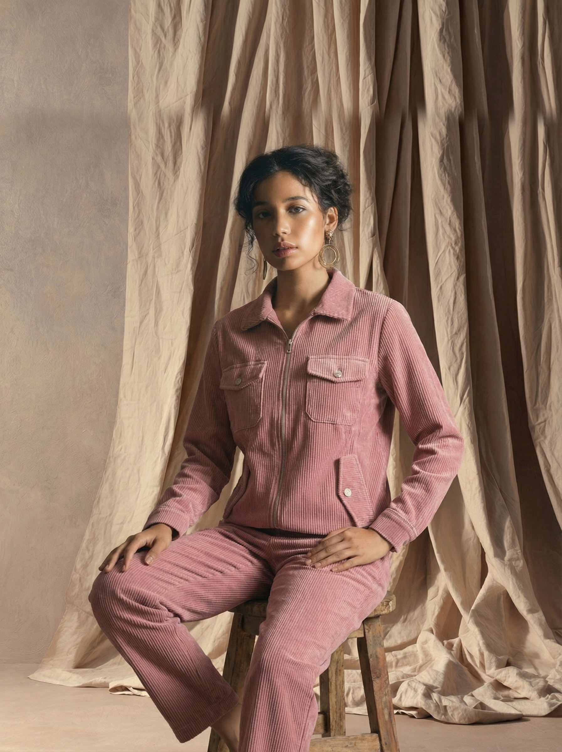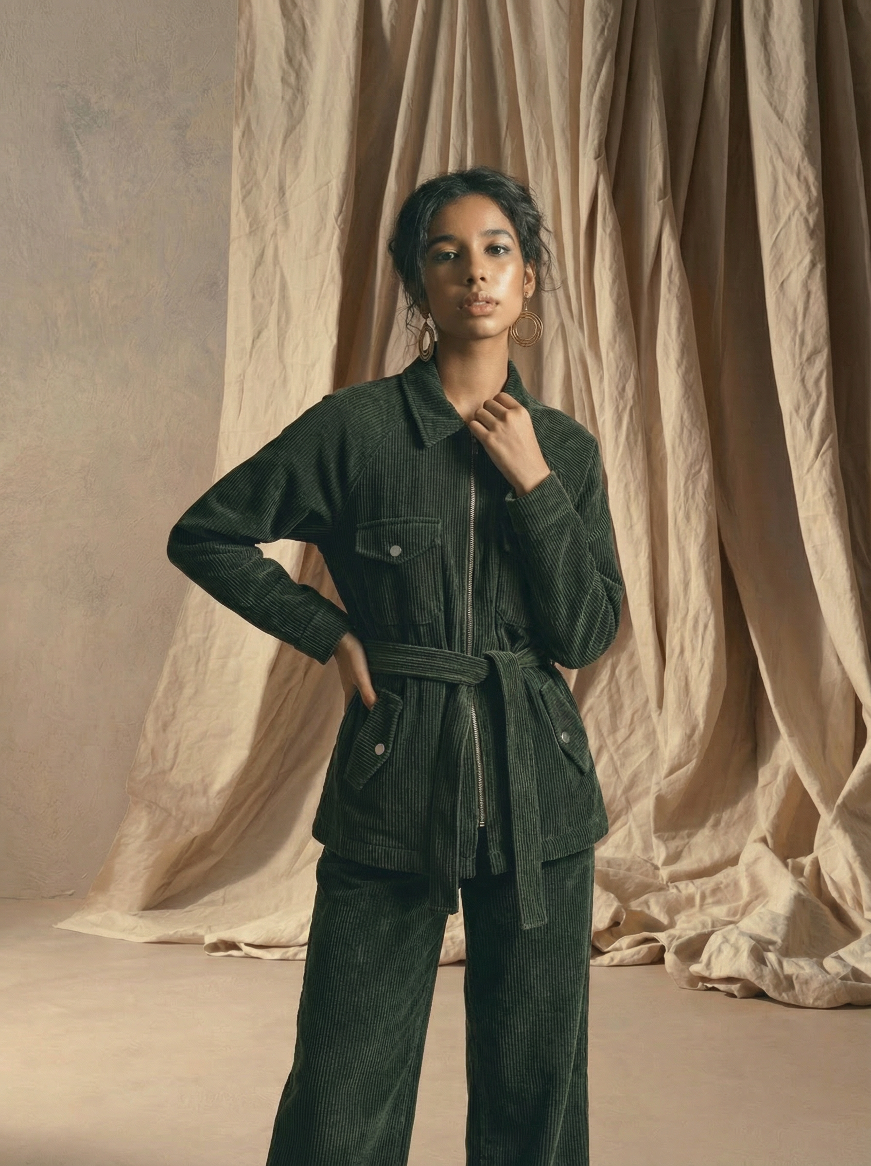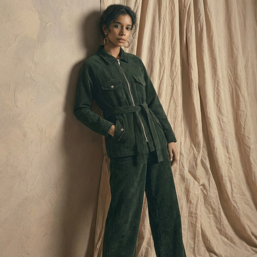 The “Nomad” set is made from soft corduroy and designed to be cozy, comfortable, and elegant. The jacket has front pockets, a clean zipper, and a matching belt that shapes the waist in a simple, flattering way. The wide-leg pants add an easy, flowy look that feels stylish all day long. The set fits perfectly with the ikat theme of the collection, mixing a feminine touch with practical everyday wear. Available in cherry red, olive green, pink, and beige.
