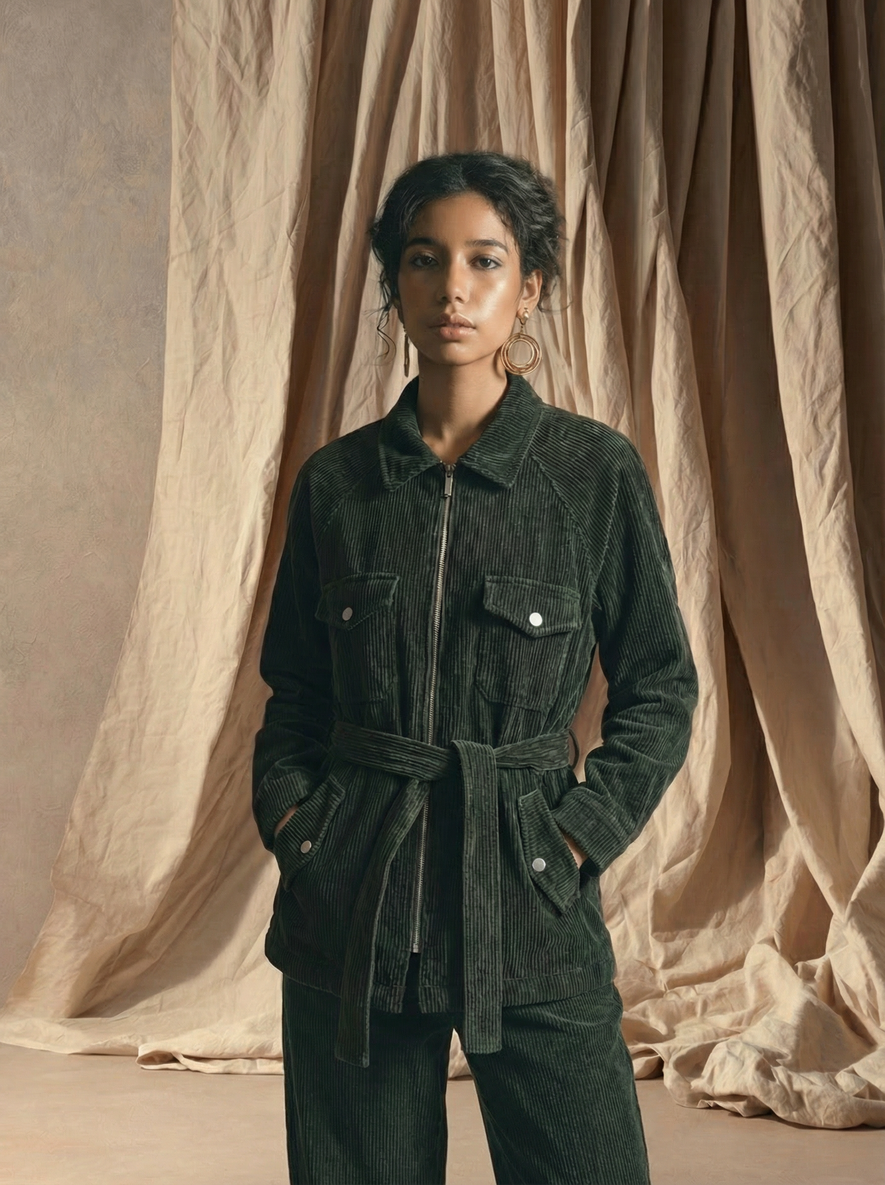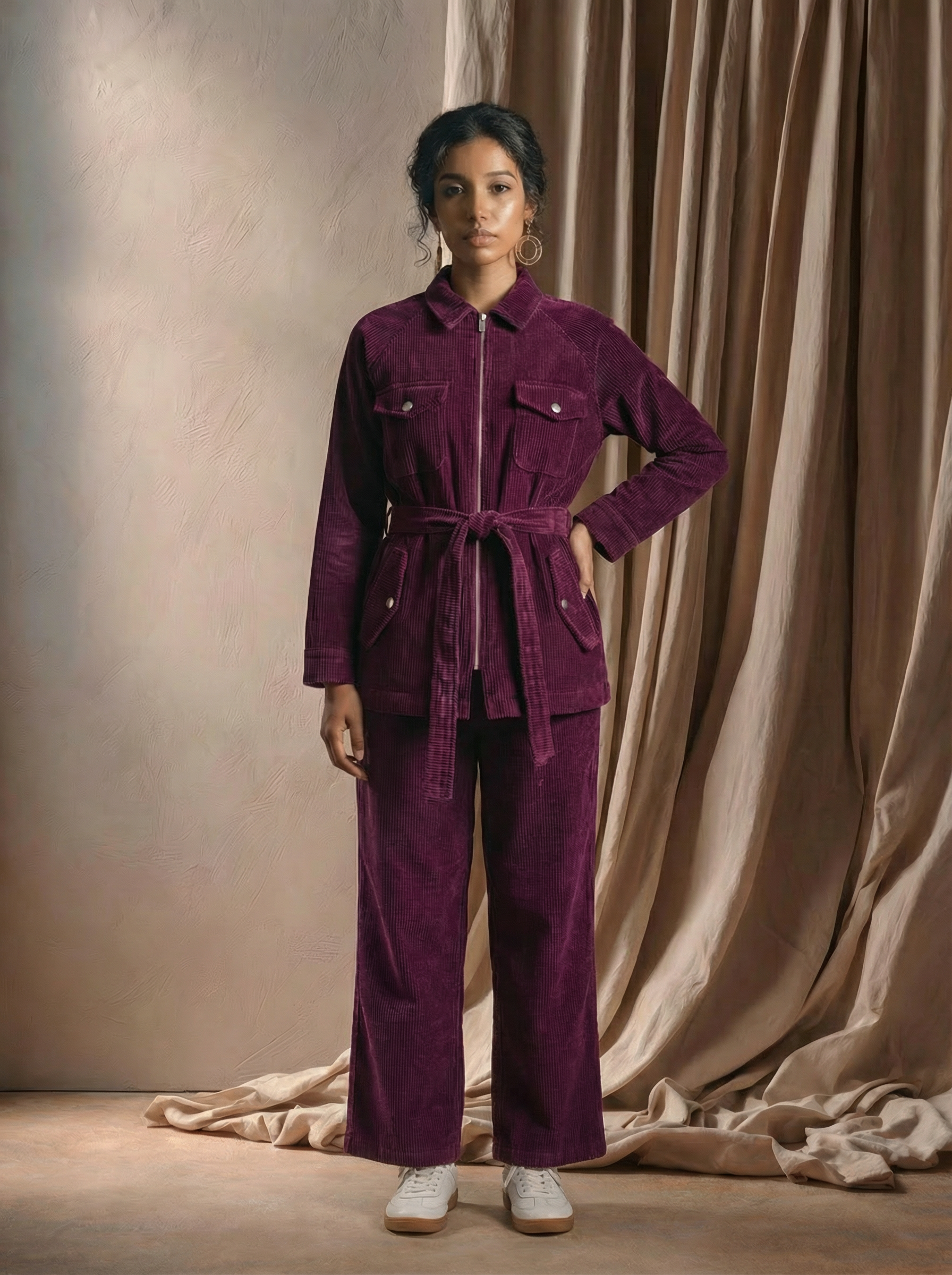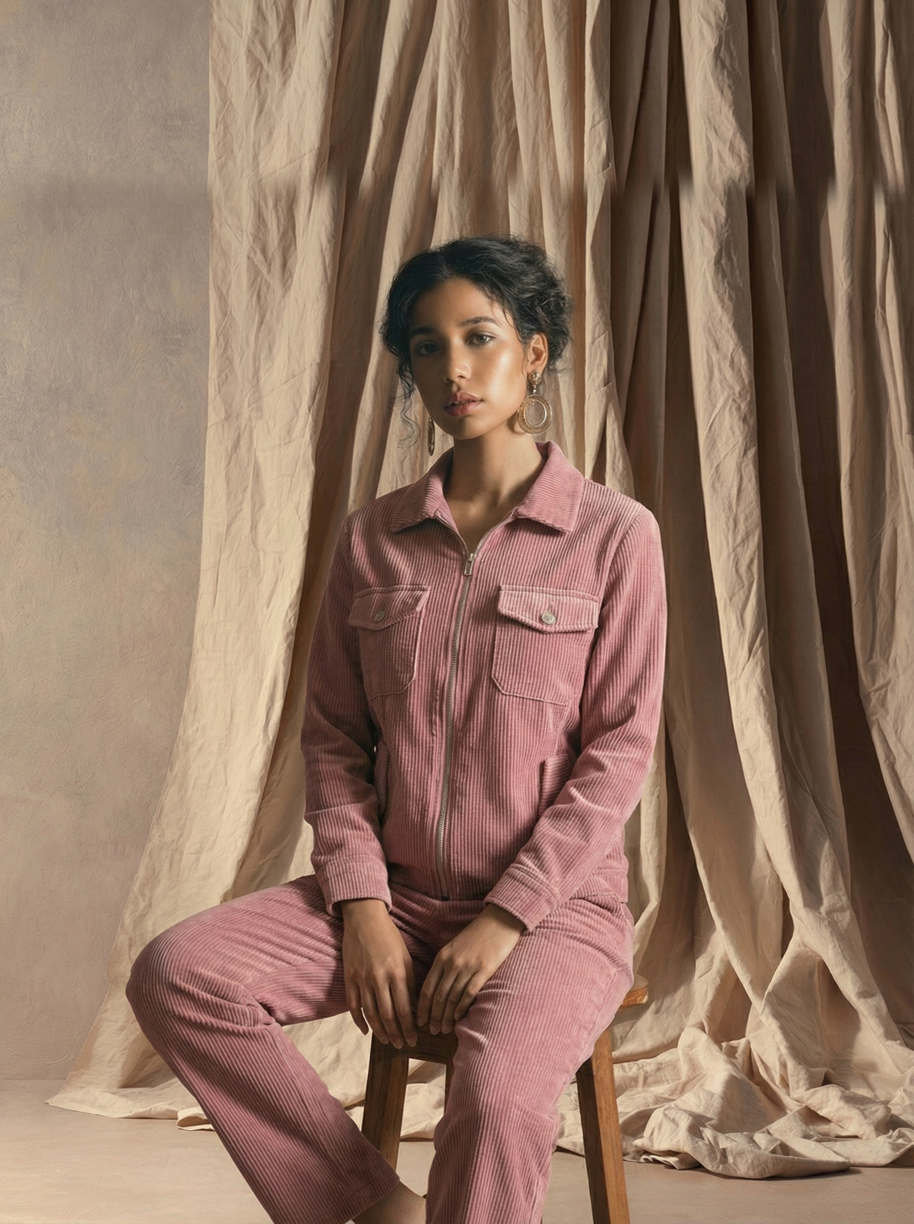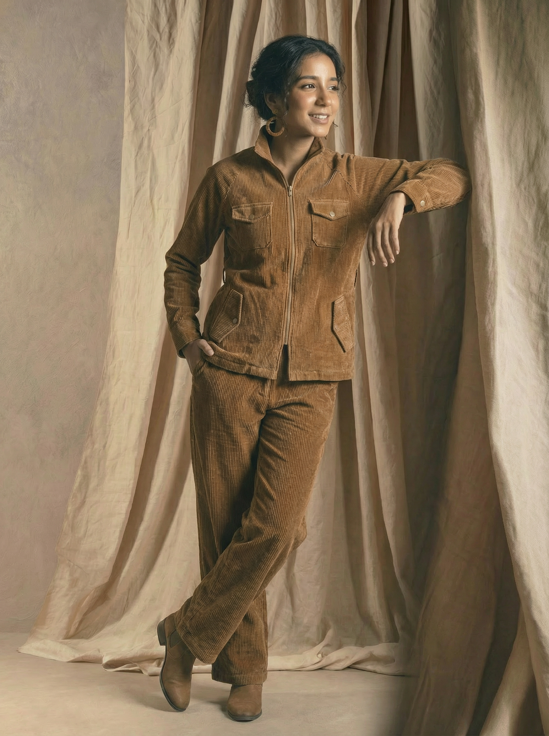 The “Nomad” set is made from soft corduroy and designed to be cozy, comfortable, and elegant. The jacket has front pockets, a clean zipper, and a matching belt that shapes the waist in a simple, flattering way. The wide-leg pants add an easy, flowy look that feels stylish all day long. The set fits perfectly with the ikat theme of the collection, mixing a feminine touch with practical everyday wear. Available in cherry red, olive green, pink, and beige.