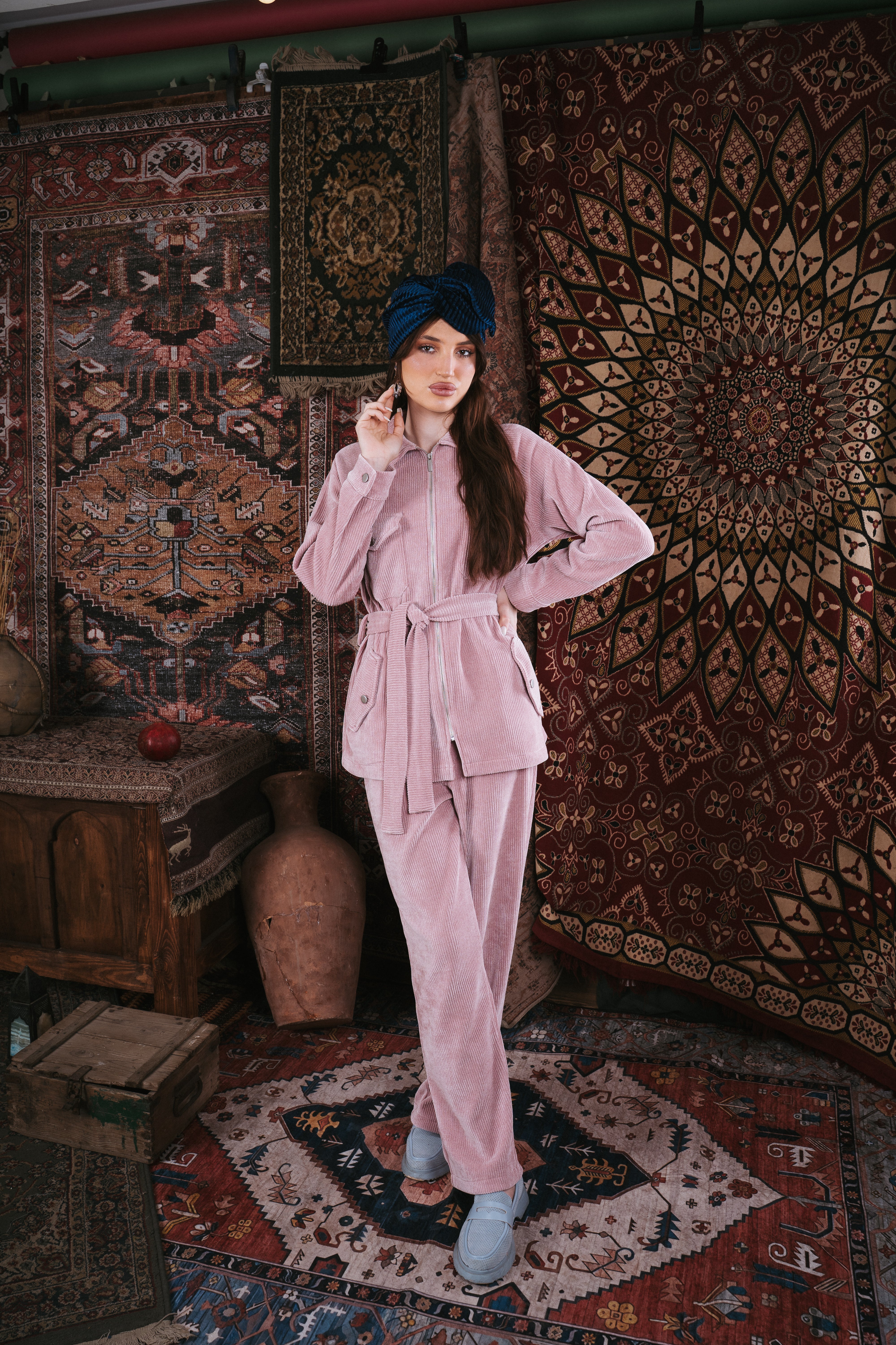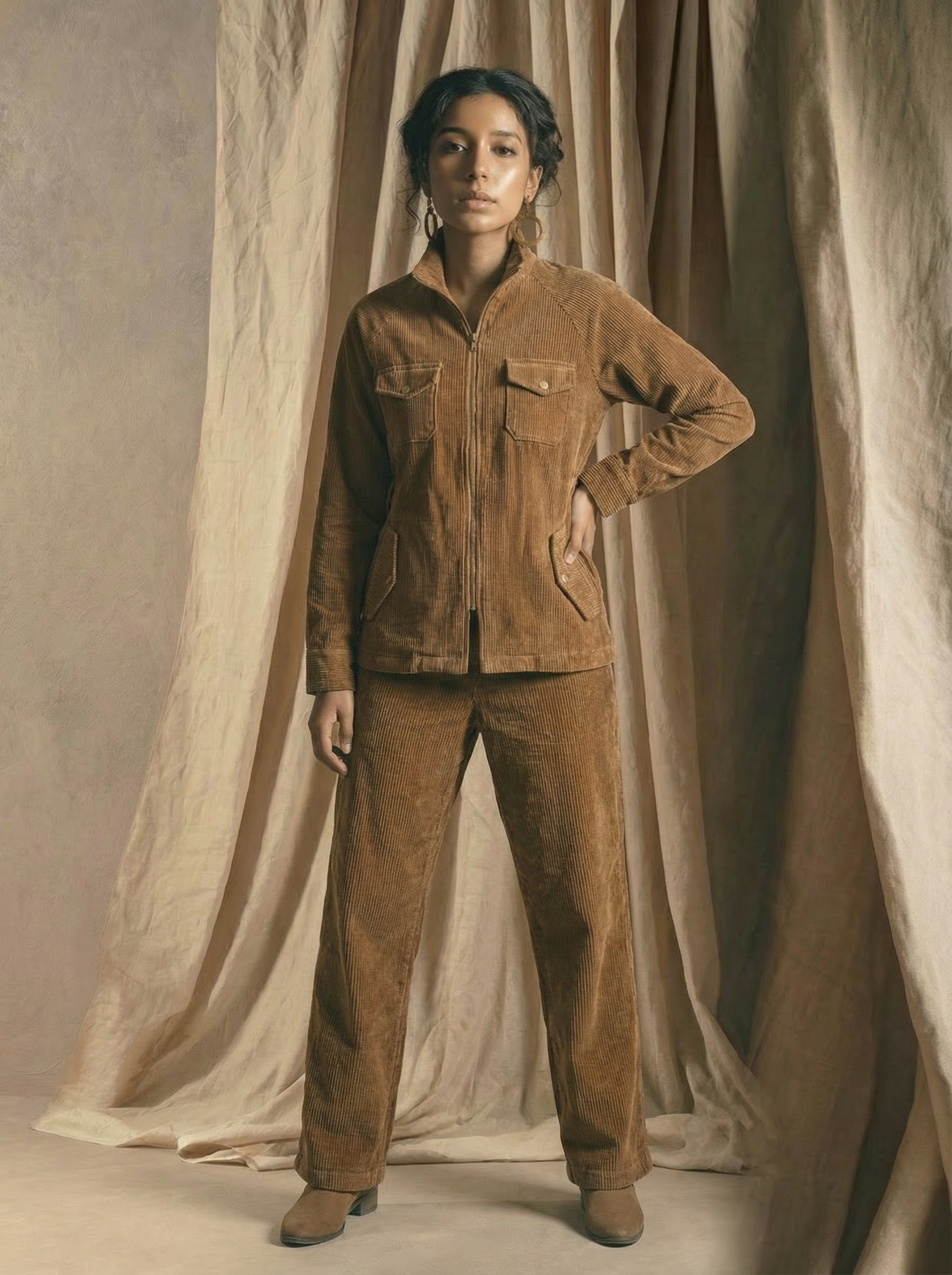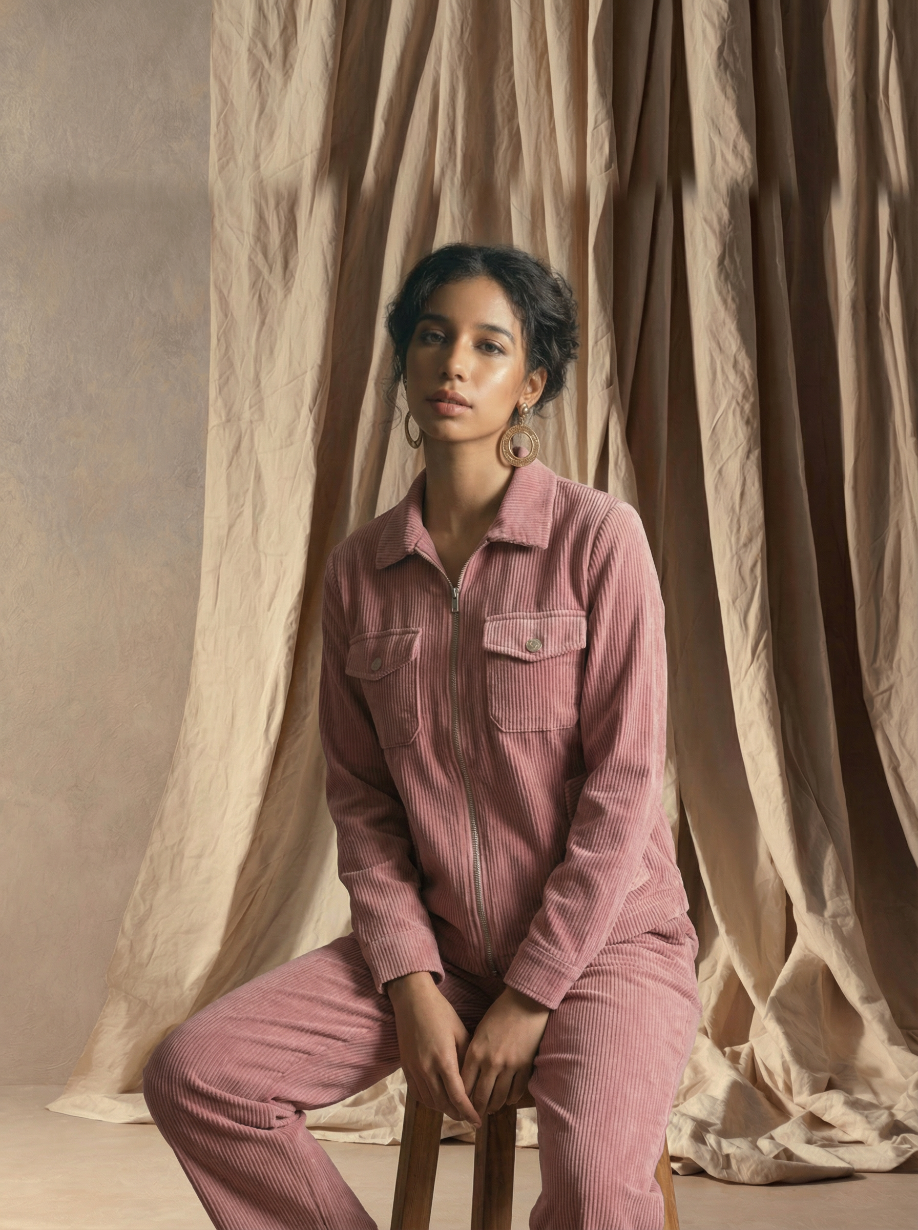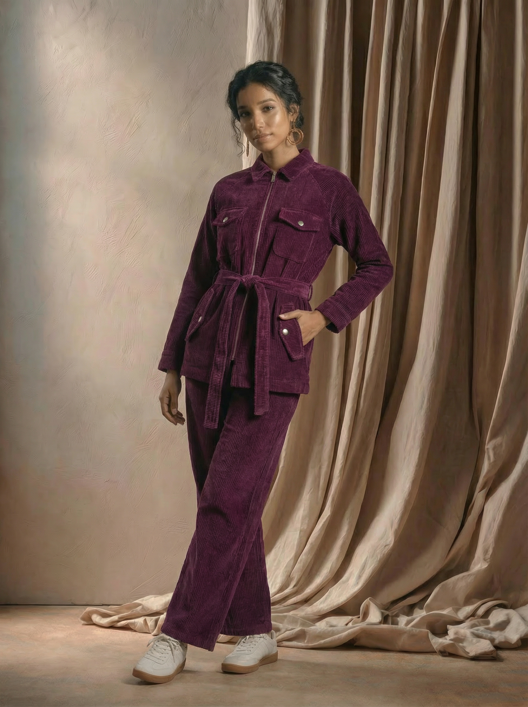 The “Nomad” set is made from soft corduroy and designed to be cozy, comfortable, and elegant. The jacket has front pockets, a clean zipper, and a matching belt that shapes the waist in a simple, flattering way. The wide-leg pants add an easy, flowy look that feels stylish all day long. The set fits perfectly with the ikat theme of the collection, mixing a feminine touch with practical everyday wear. Available in cherry red, olive green, pink, and beige.