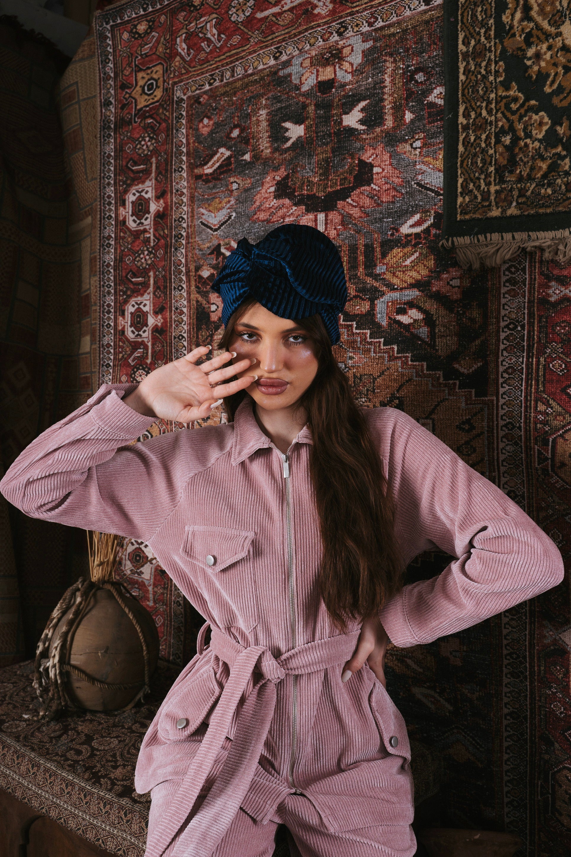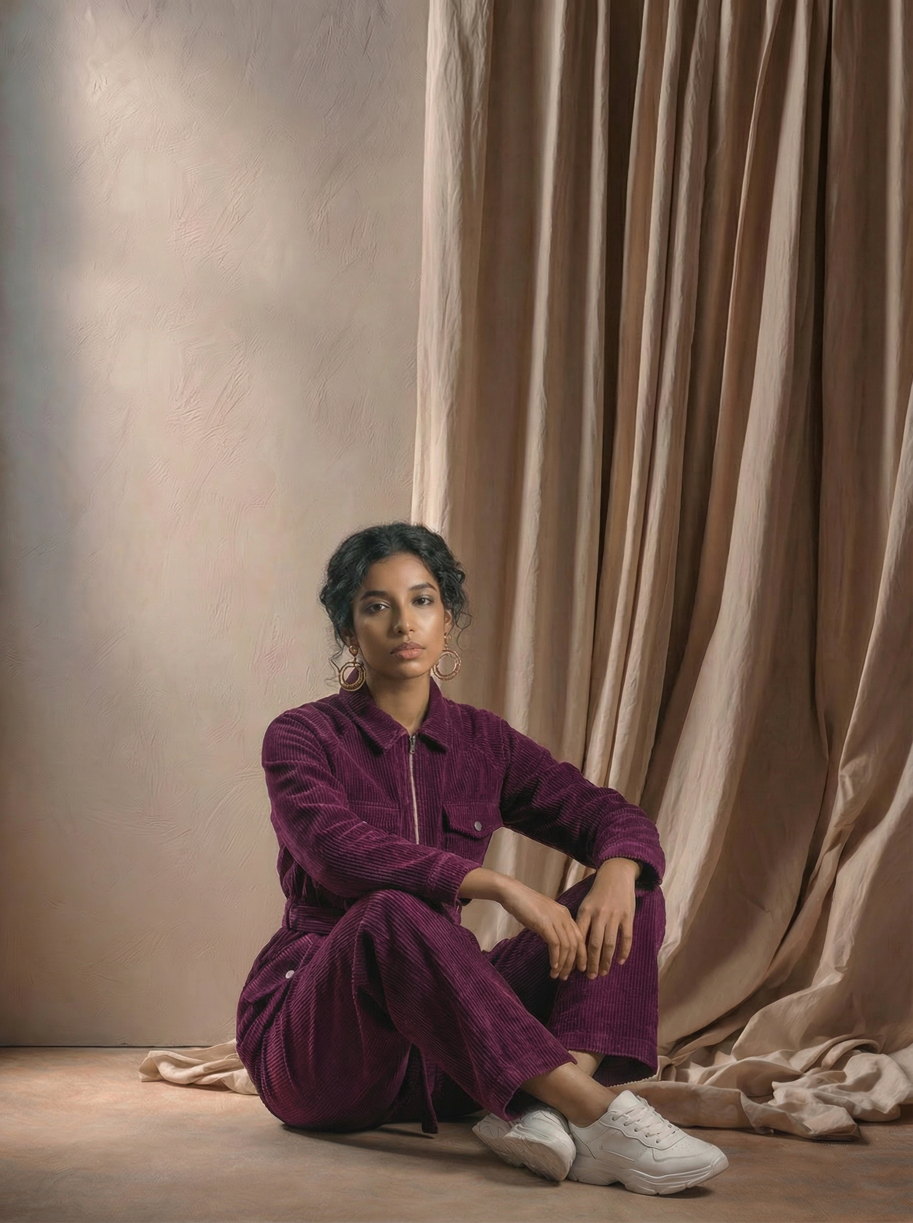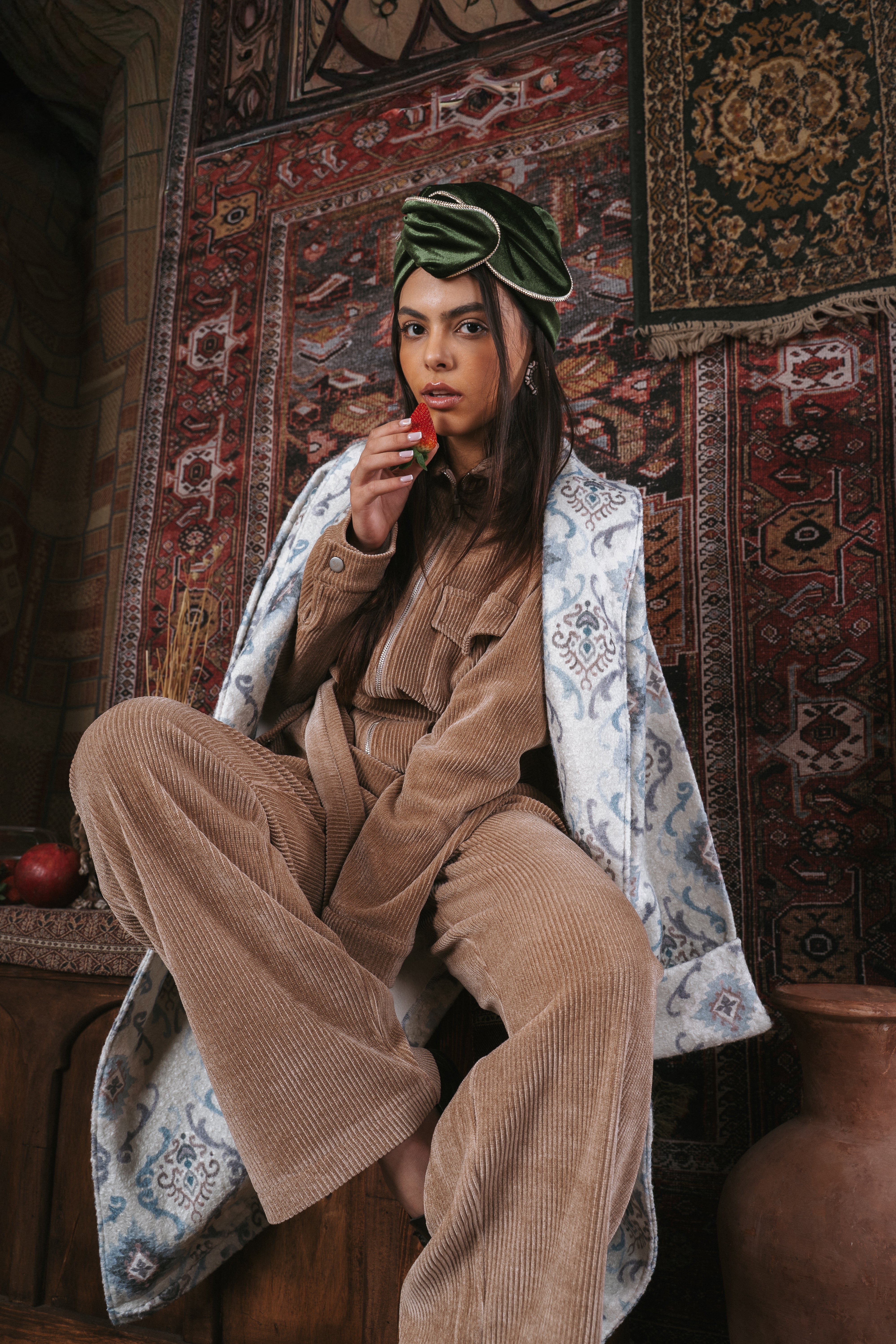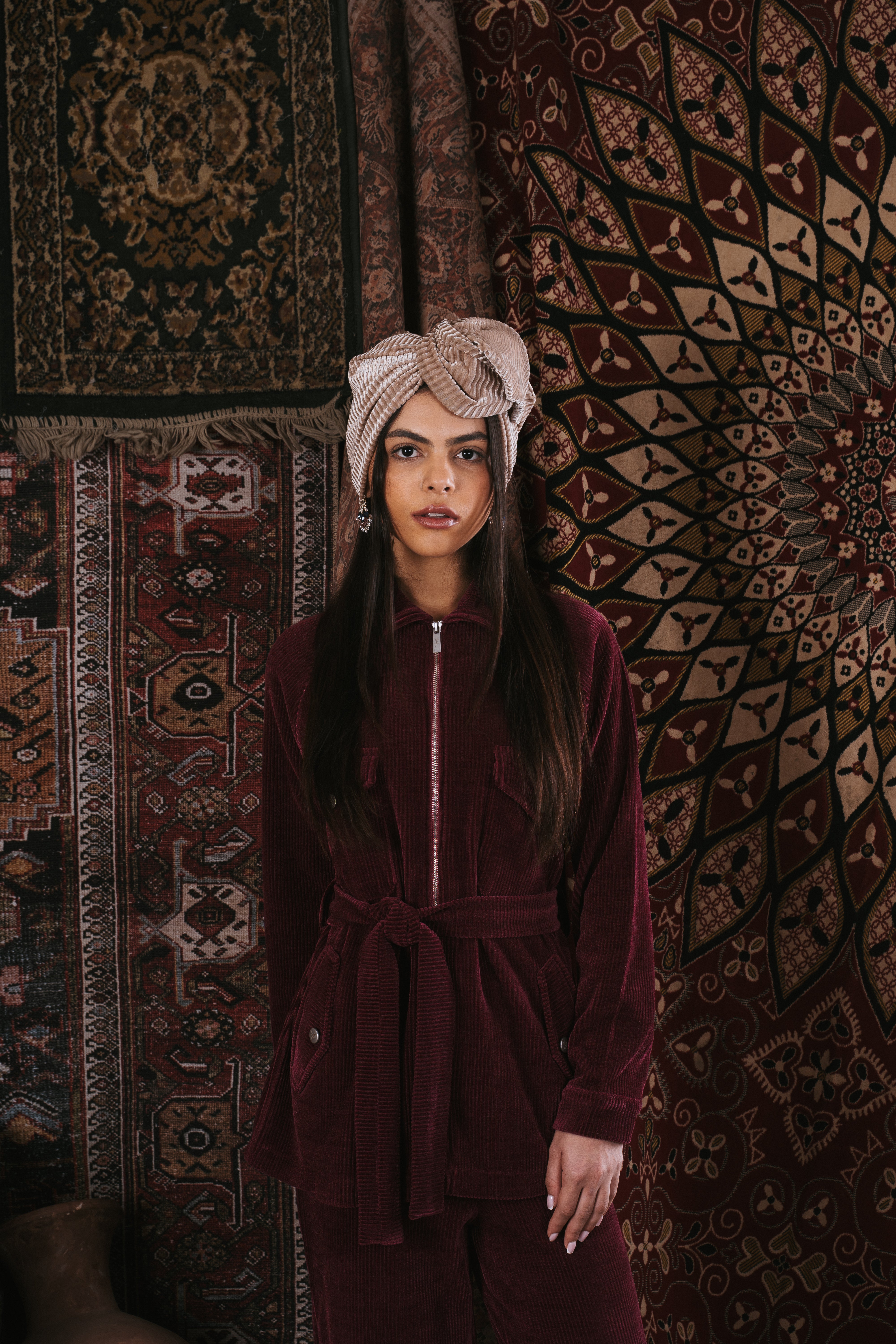 The “Nomad” set is made from soft corduroy and designed to be cozy, comfortable, and elegant. The jacket has front pockets, a clean zipper, and a matching belt that shapes the waist in a simple, flattering way. The wide-leg pants add an easy, flowy look that feels stylish all day long. The set fits perfectly with the ikat theme of the collection, mixing a feminine touch with practical everyday wear. Available in cherry red, olive green, pink, and beige.