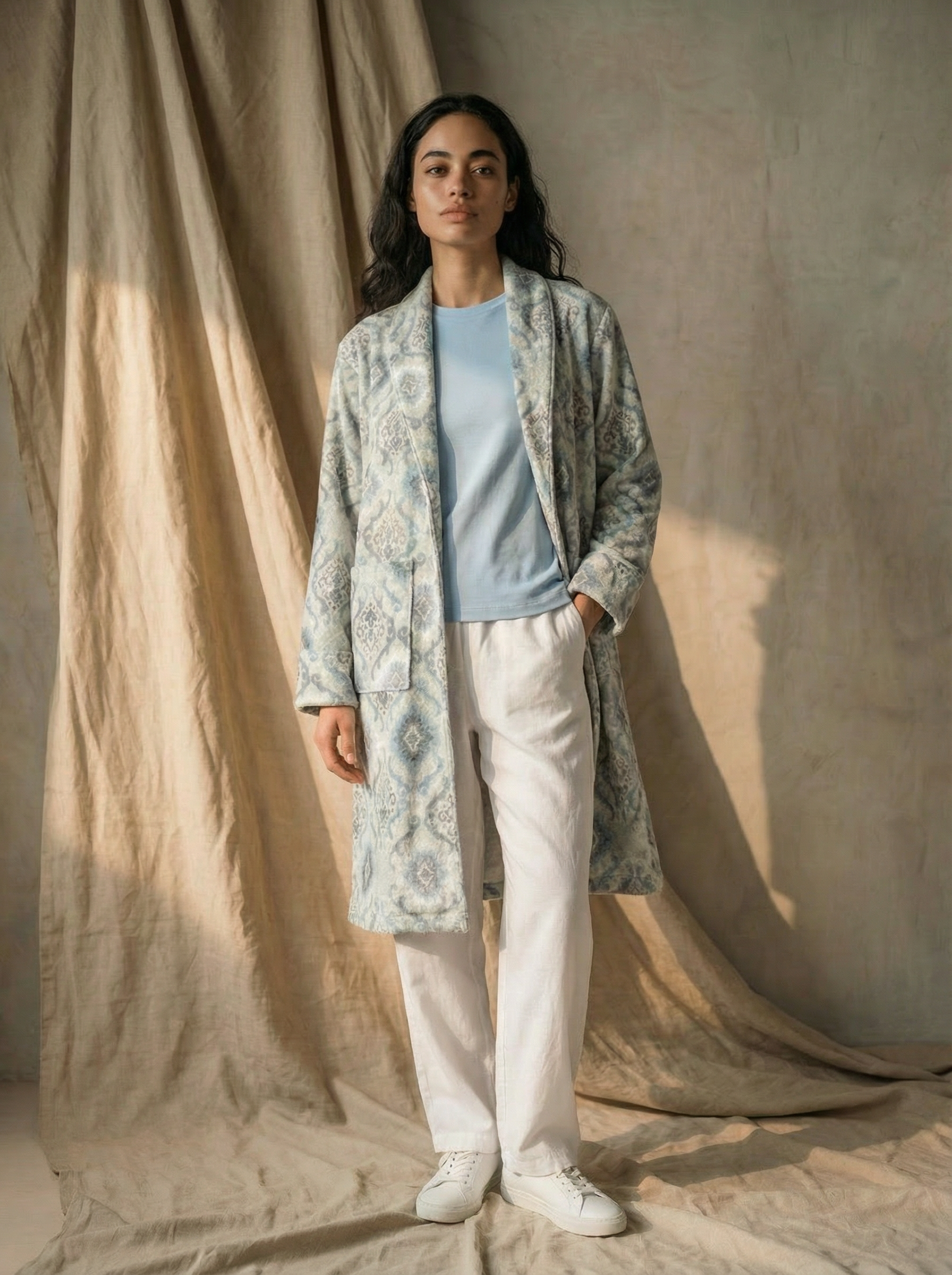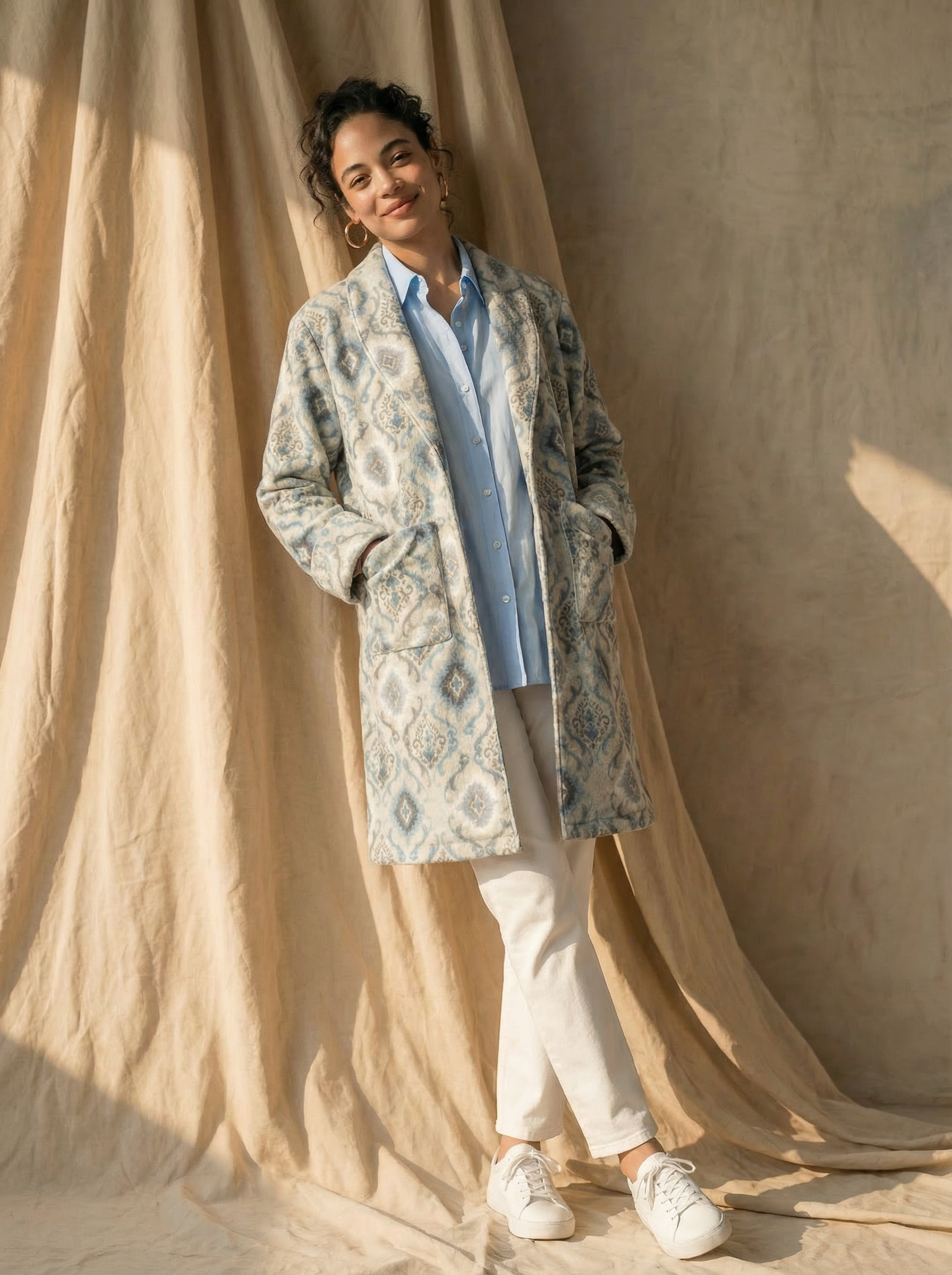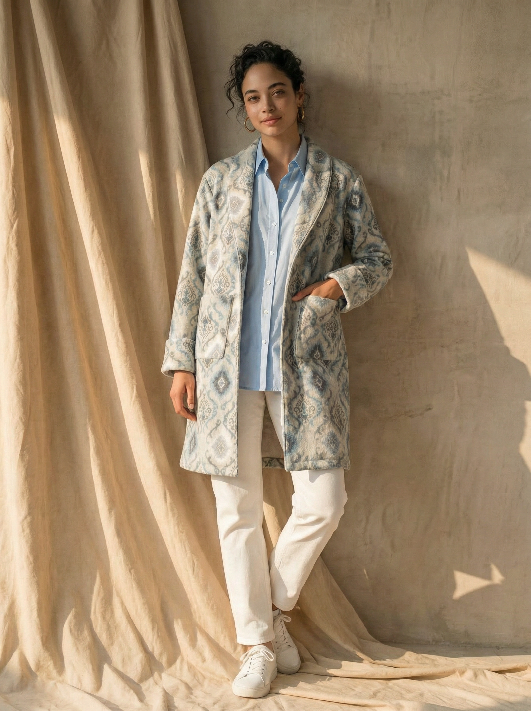 “Saphir “is a soft wool coat designed with a Chanel-inspired shape that feels elegant, warm, and easy to wear. The print is clear and balanced, mixing soft blues, greys, and beige in a clean ikat pattern. The coat features a straight cut, practical front pockets, and a matching belt that lets you adjust the fit. Comfortable and stylish, Saphir is a simple statement piece for everyday wear.