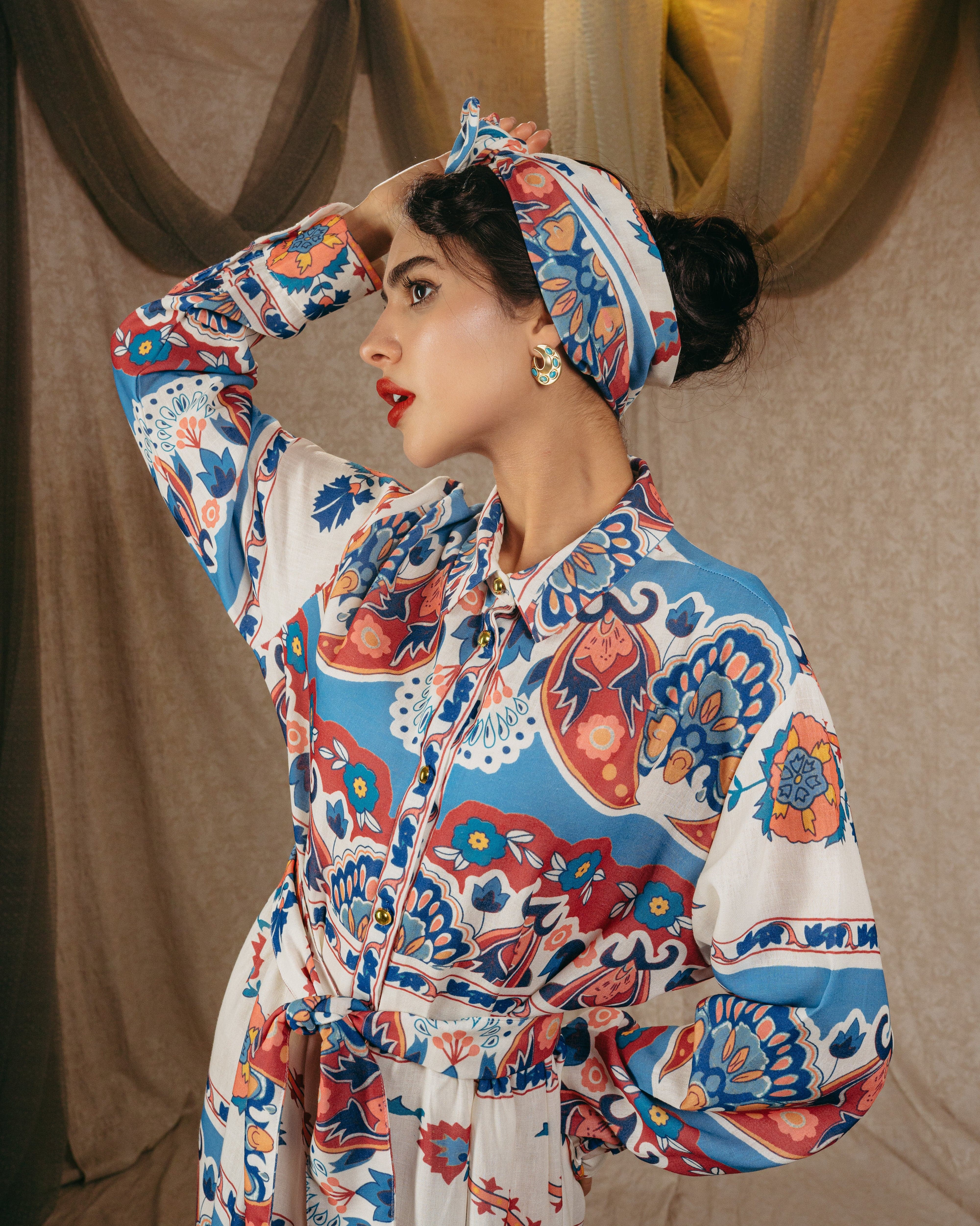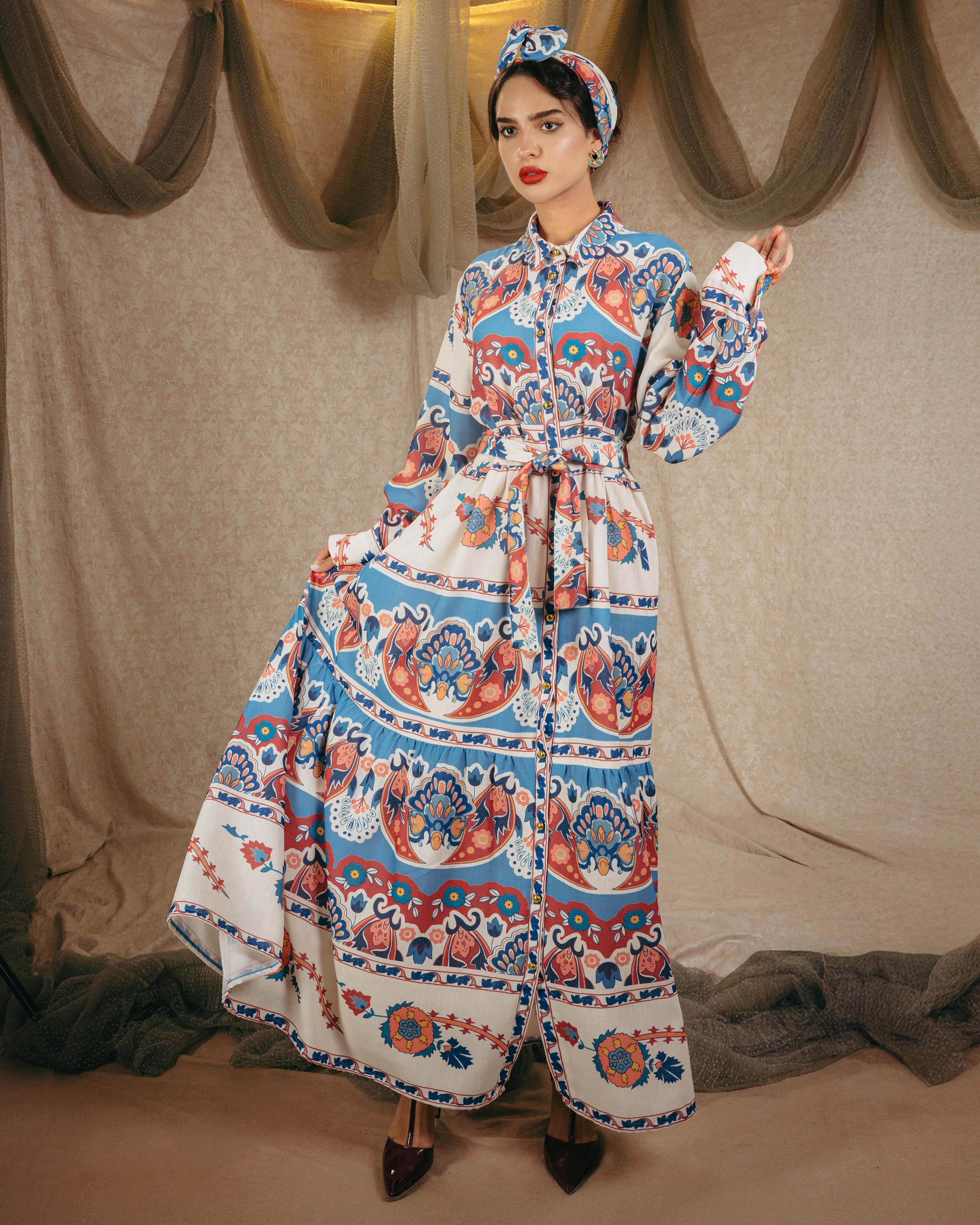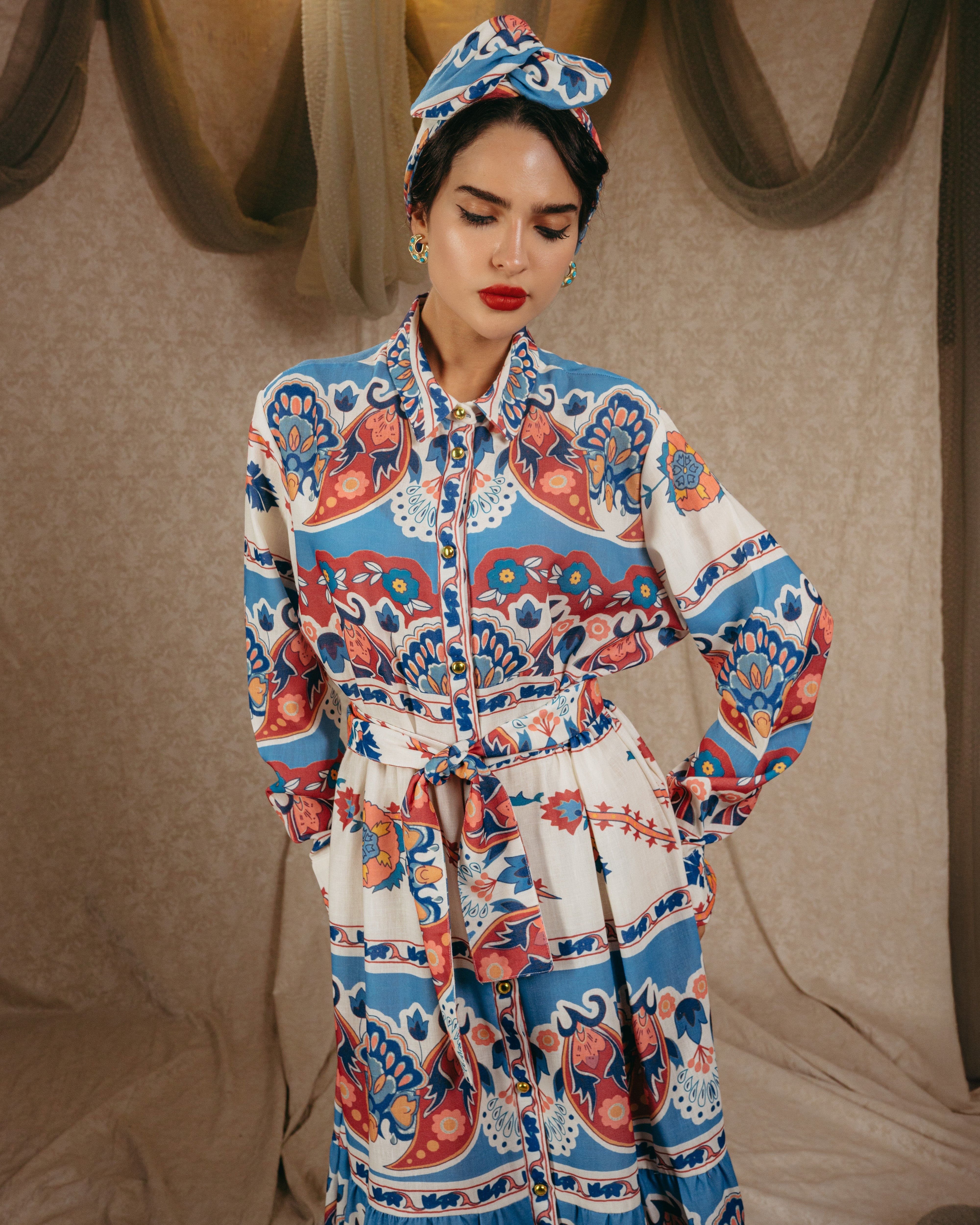 Indulge in elegance with the “Sweet Vintage” shirt dress. Every inch of this masterpiece is crafted from a fabric that resembles a beautifully detailed vintage painting, turning the dress into a wearable work of art. With its classic silhouette and artistic charm, this design is perfect for those who appreciate chic sophistication with a touch of nostalgia.