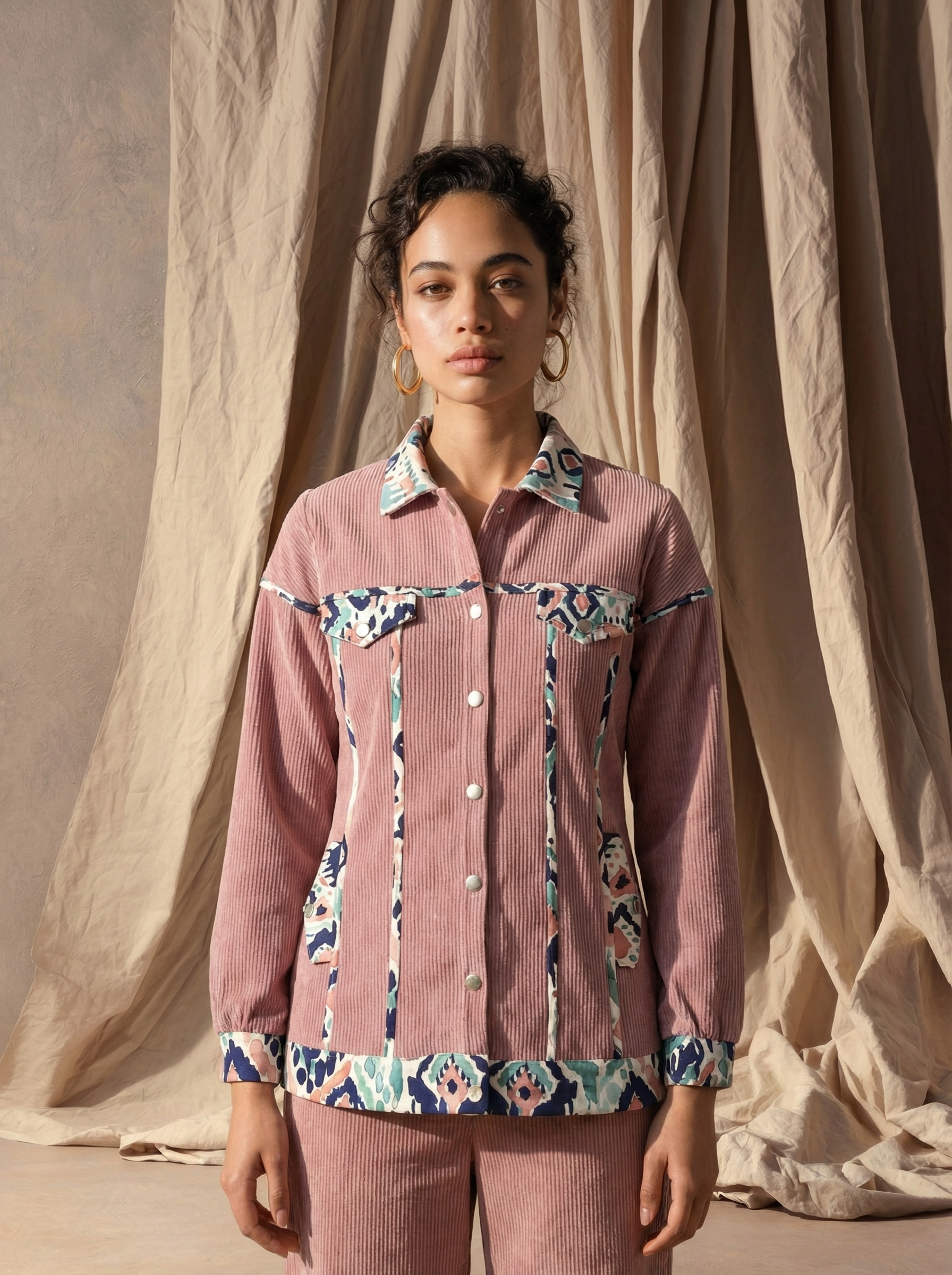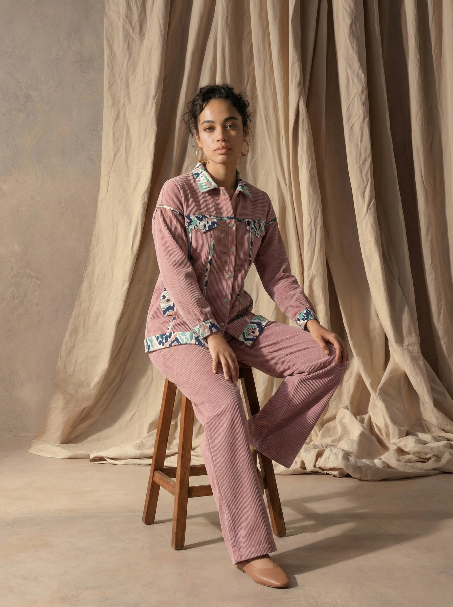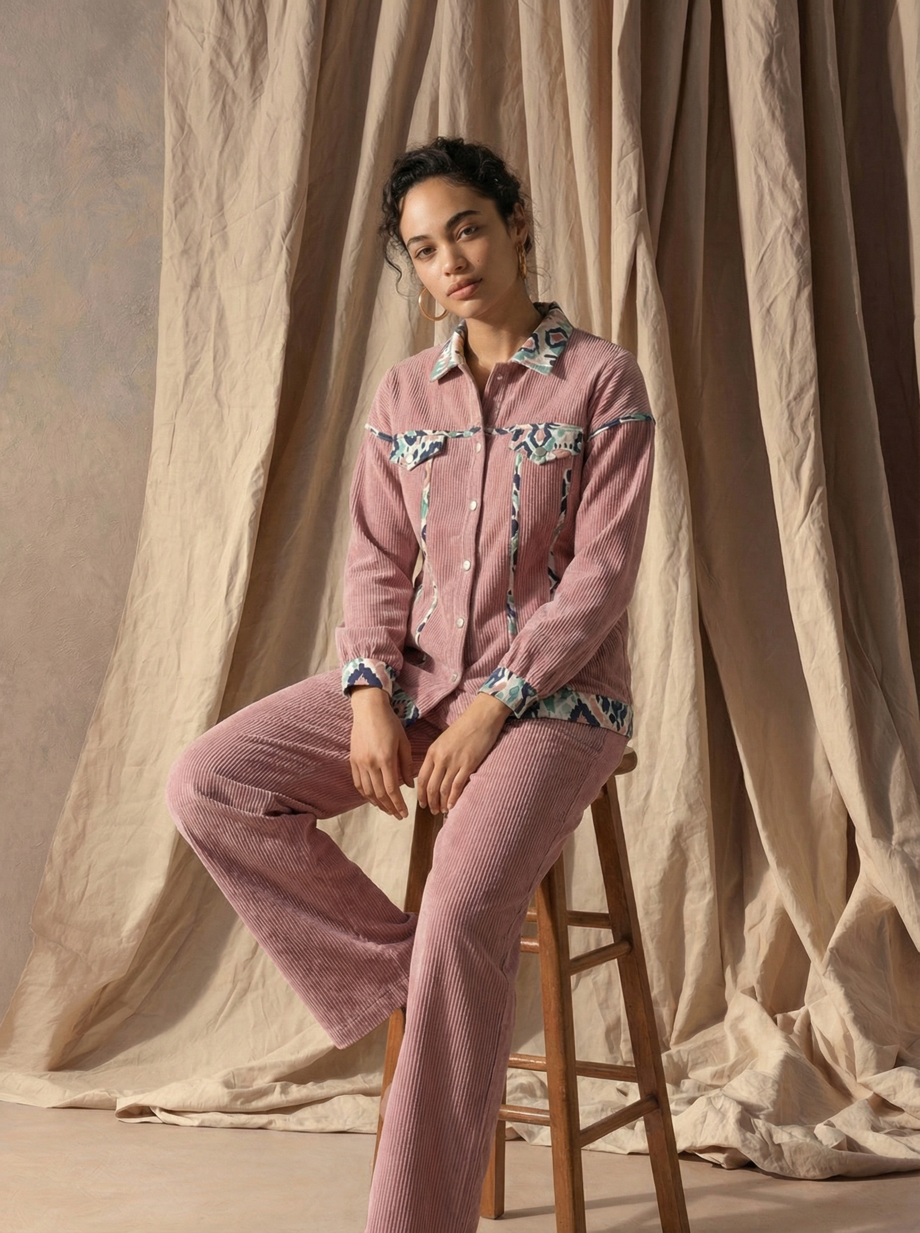 “Velura”is a vibrant set that mixes soft pink corduroy with colorful ikat wool details. The jacket features playful printed trims, pockets, and accents that give it a lively, feminine character. The matching pants are wide-leg and comfortable, designed for easy everyday movement. The combination of textures and colors makes Velura stylish, warm, and full of personality.