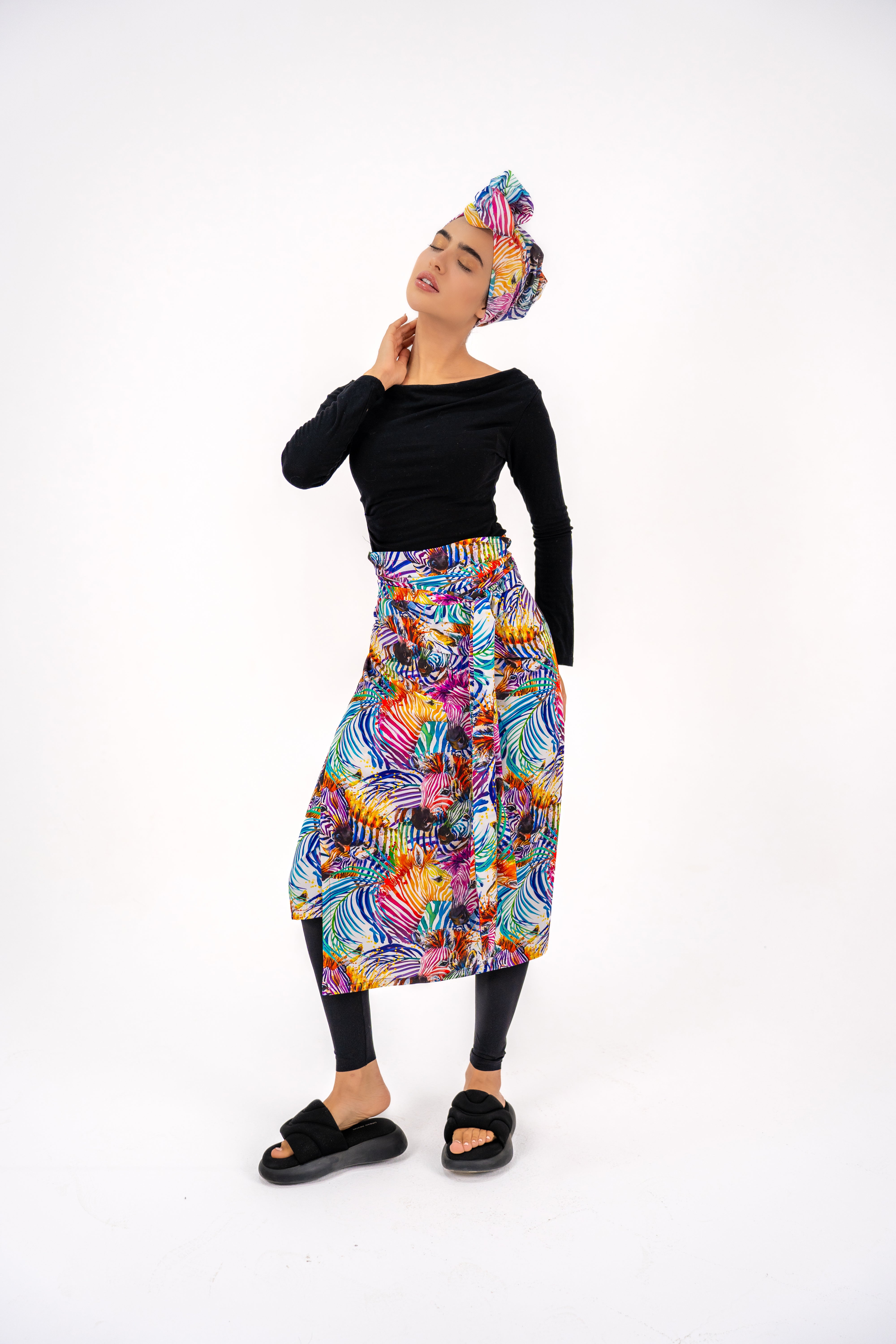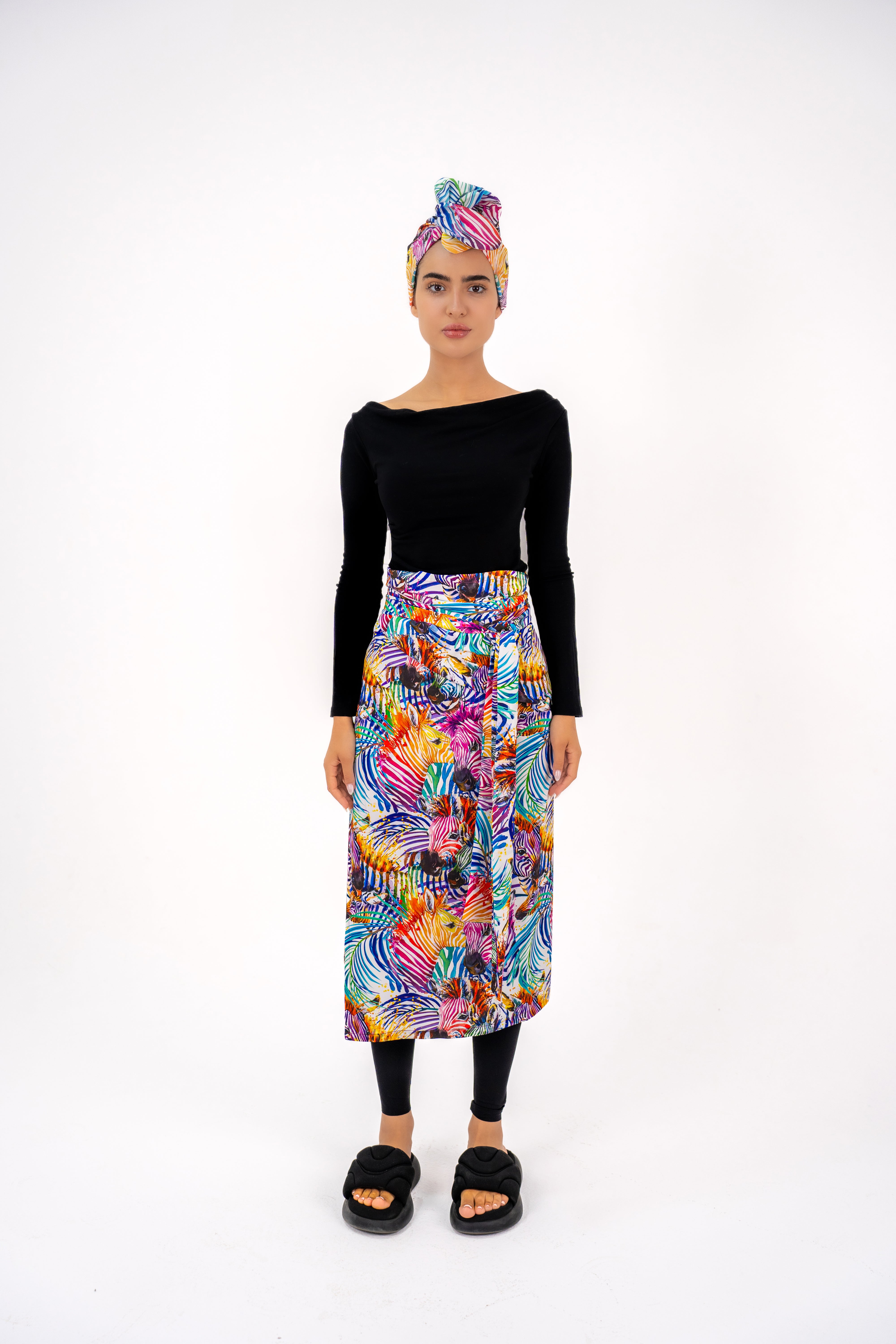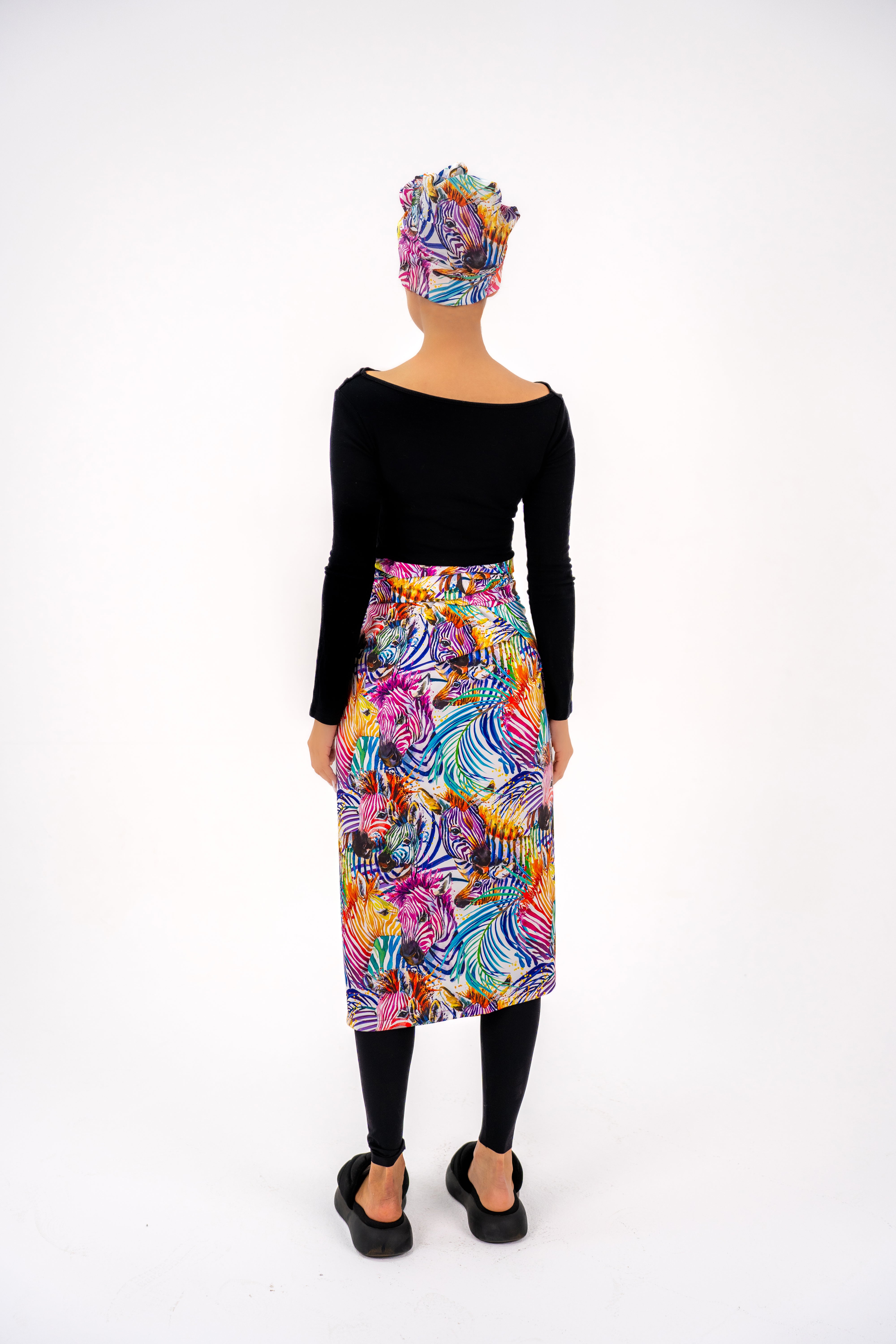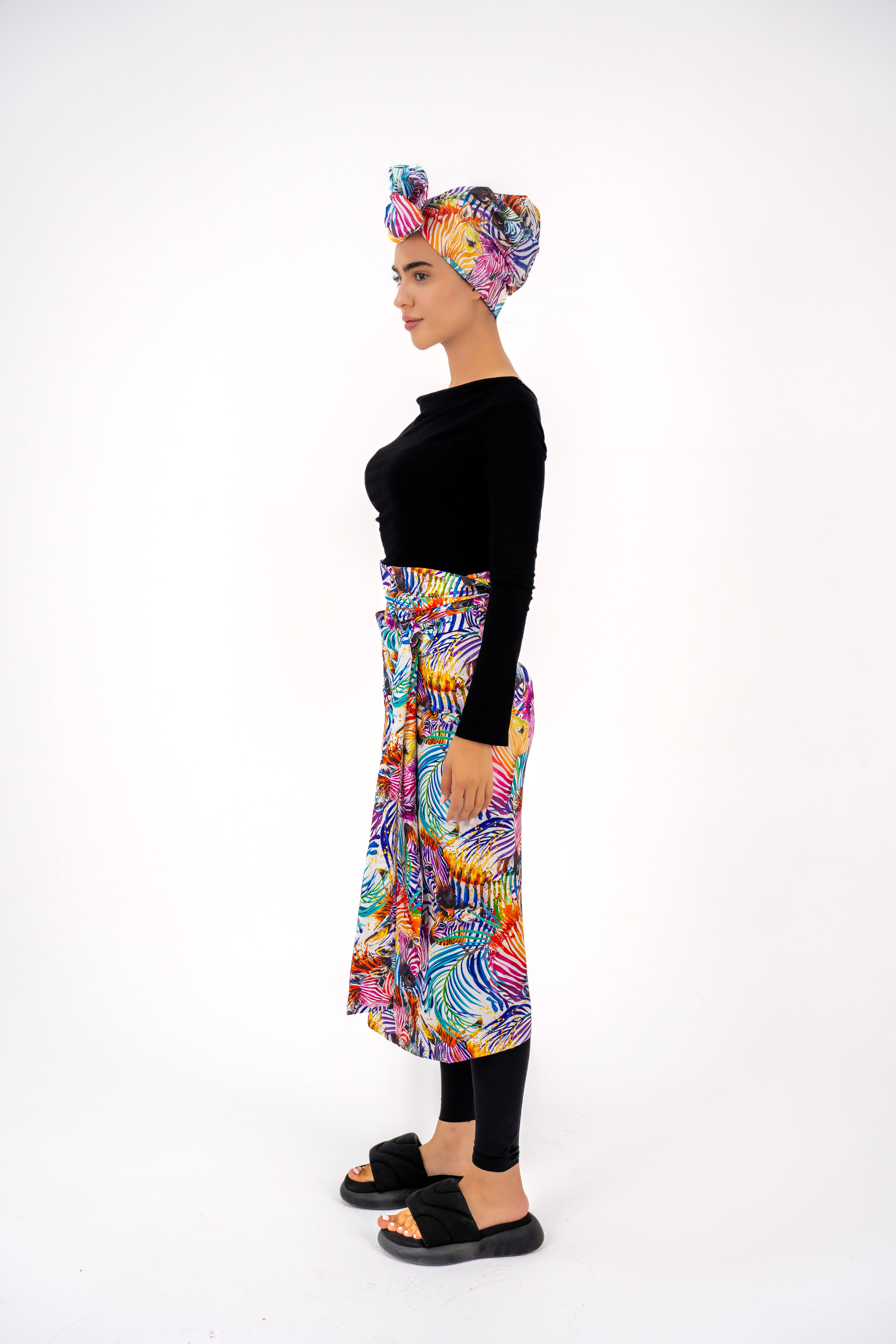 Wild Heaven A wrapped cover-up in a new comfy SBH material, a new concept, your go-to cover-up, and wrapped dress, style it in 3 different ways: wrapped dress, cover-up, and skirt, the mix between the animal zebra print and the rainbow colors gives you the freedom of wild life with the heavenly touch of summer.